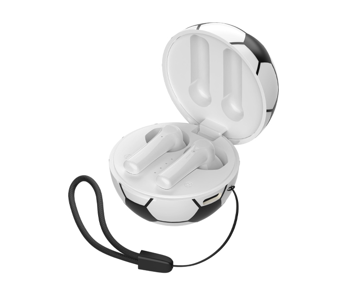 GOAL - Audífonos TWS inalámbricos Bluetooth con estuche de carga de 220 mAh en forma de balón de fútbol soccer. Cuentan con función de manos libres, alcance de hasta 10 m, entrada tipo C (incluye cable) y correa para transporte. Compatibles con dispositivos Android e iOS. Presentación: Caja a color.