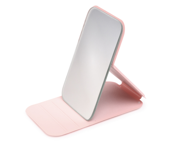 XÓCHITL - Espejo de bolsillo plegable, cuenta con cubierta de PU que sirve para proteger el espejo y como soporte con 3 niveles de inclinación.