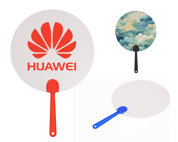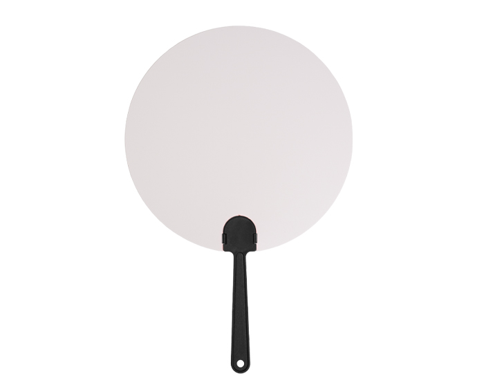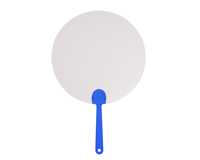 ZAIRA - Abanico redondo de plástico, con amplia área para impresión, cuenta con mango de color.