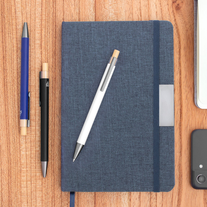Bolígrafo "VUMY" Bolígrafo retráctil. Cuerpo metálico en diferentes colores acabado mate. Clip metálico y puntera plástica color gris acabado mate. Pulsador de bambú.