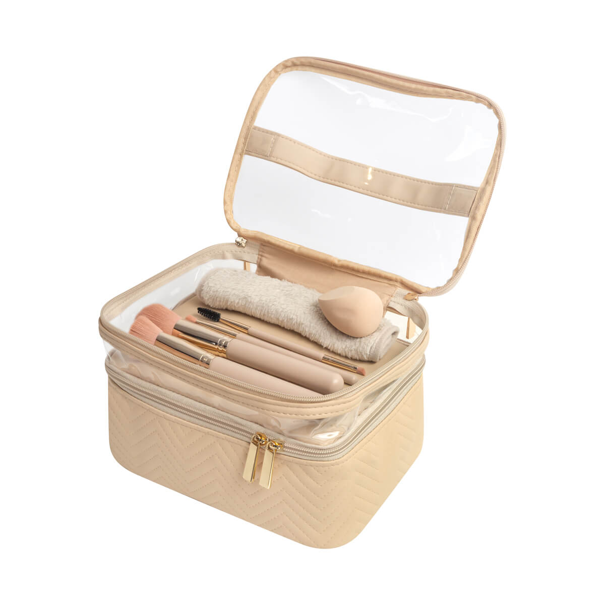 NECESER YARA - Neceser fabricado en PU con cuerpo semirrígido. Cuenta con dos niveles con cierre, ideales para organizar y separar productos de belleza o higiene personal. Su panel superior de mica transparente permite visualizar el contenido fácilmente, mientras que el asa facilita su transporte. Ideal para guardar productos de belleza, cuidado personal o maquillaje.