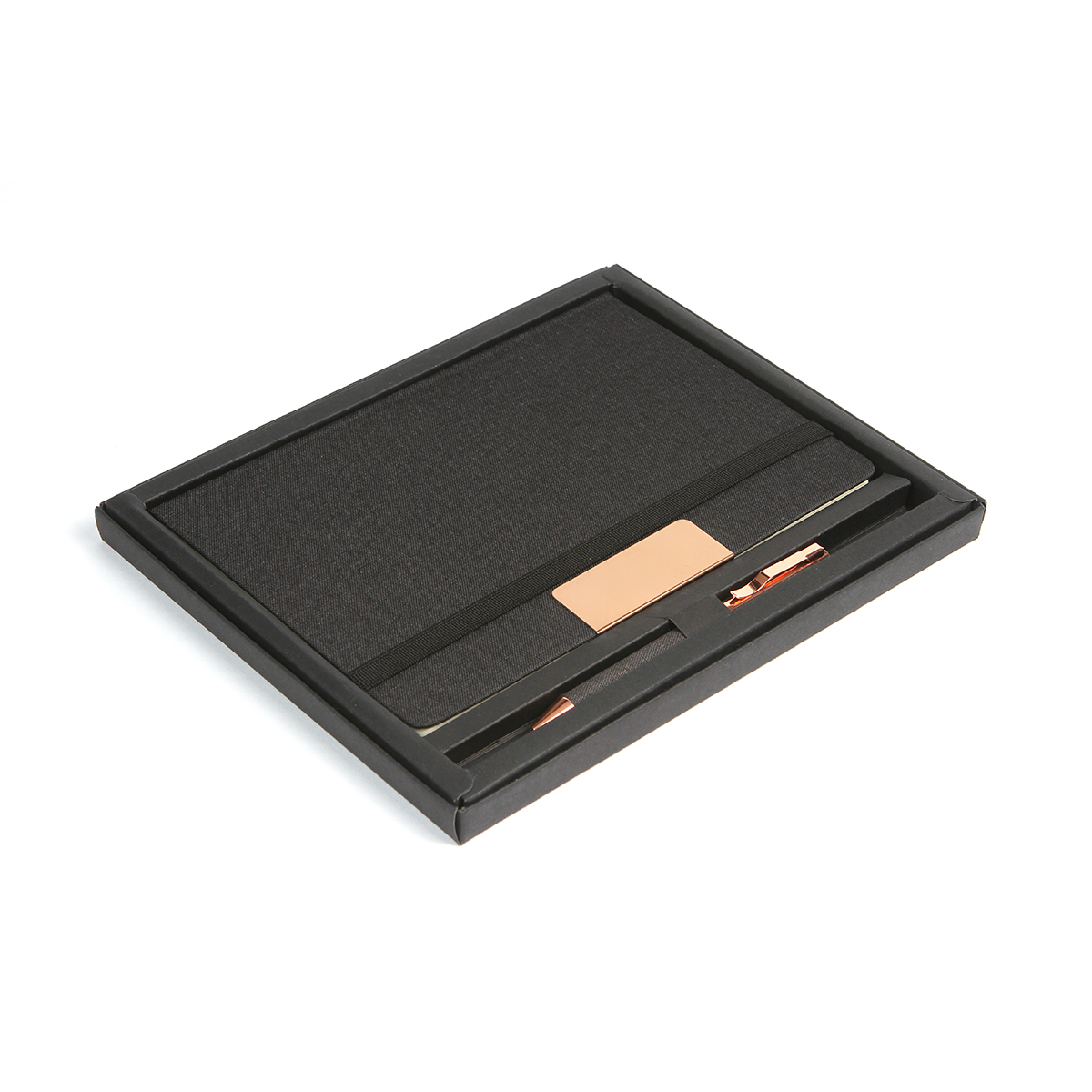 MEDIDAS: Libreta: 21x14.5 cm. | Bolígrafo: 13x1.1 cm. | Caja: 23.5x19x1.8 cm. IMPRESION: Grabado láser / Serigrafía MED. EMPAQUE: 44x32x27 PIEZAS EMPAQUE: 30