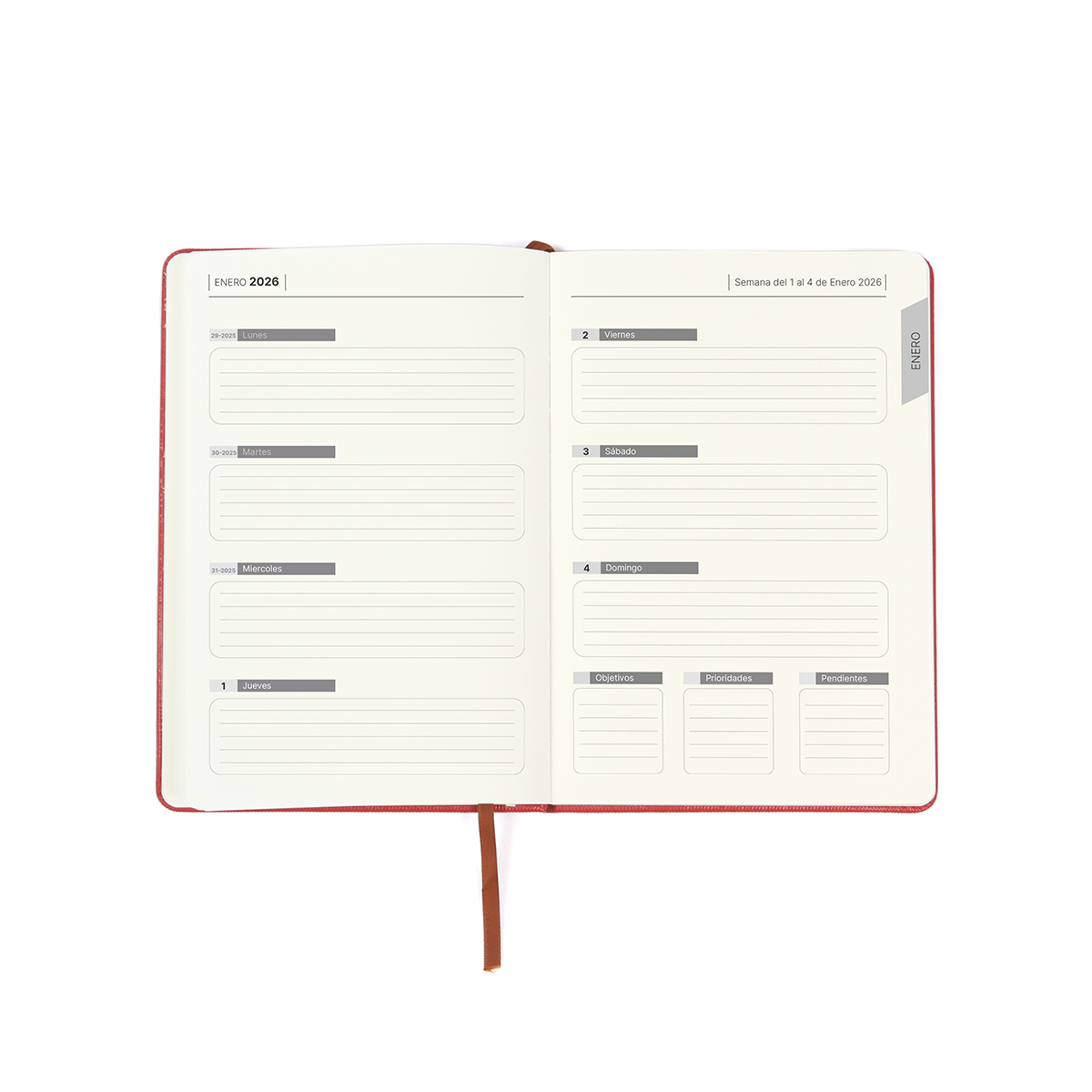 Agenda Semanal Batok. - Set de Agenda semanal 2026 con pluma y caja de regalo. Cubierta fabricada en curpiel (PU) con resorte sujetador e interior con 80 hojas de 65 g. Cada semana tiene espacio para tareas importantes y está organizada por horario (5:00 am - 22:00 pm). Cuenta con: Separador de hojas, Calendario anual 2025-2027, planeador mensual, hoja de objetivos anuales, hoja de pendientes mensuales, espacio para notas, tareas, sección de contactos y bolsillo interno para almacenar documentos. Incluye caja de cartón individual y bolígrafo con tinta de escritura negra.