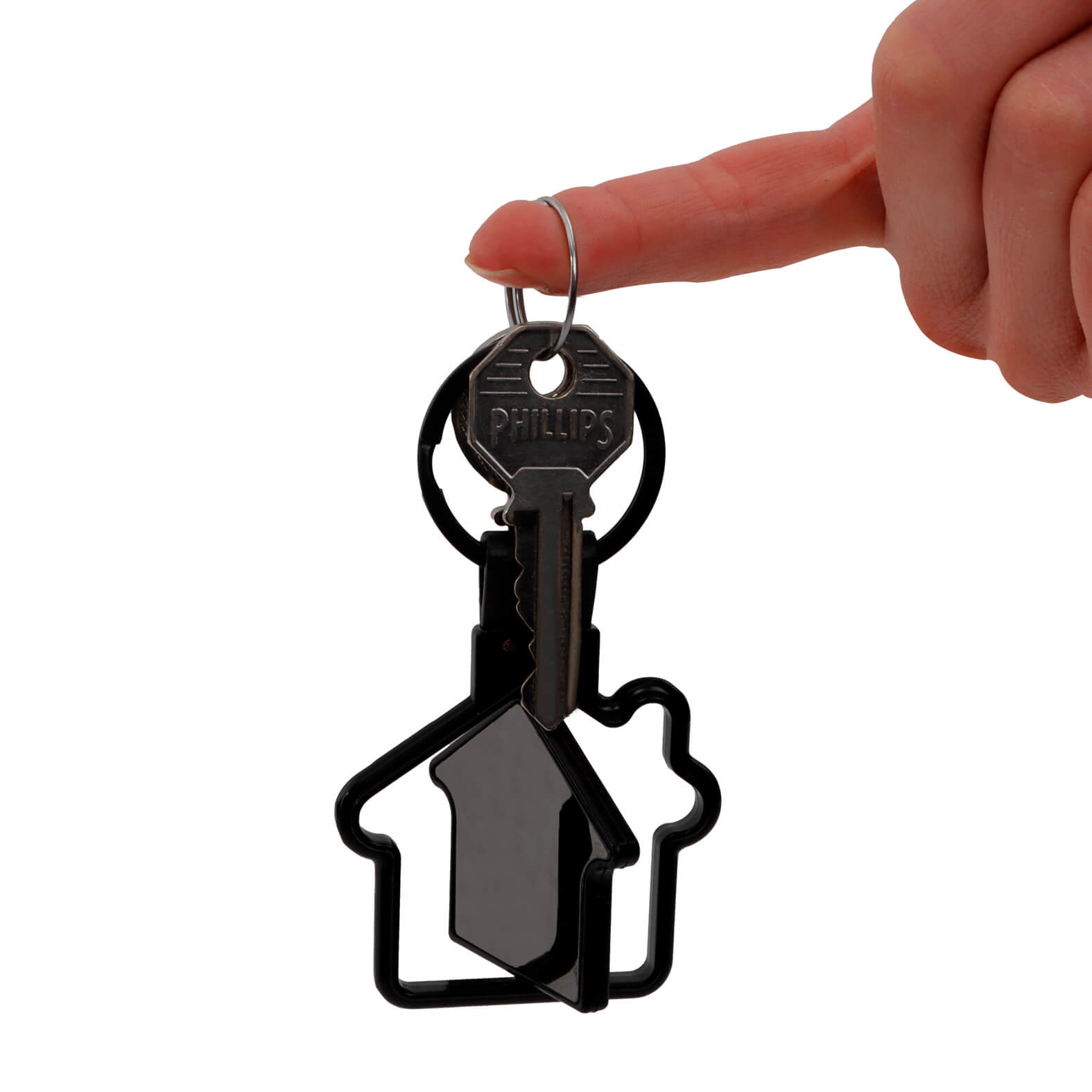 VILLA Llavero de metal en forma de casa con silueta girable y acabado espejo.