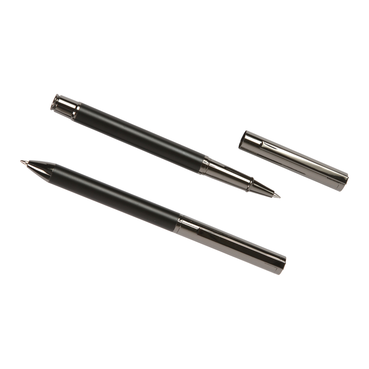 Set de bolígrafos Baligill. - Juego de dos bolígrafos metálicos premium, con diseños elegantes y acabados de alta calidad. Incluye un bolígrafo con mecanismo de giro tinta AZUL y otro bolígrafo con mecanismo tipo roller con tinta AZUL. Los dos cuentan con cuerpo bicolor, detalles metálicos sofisticados.