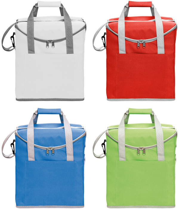 COOLER "MAX" Lonchera térmica con recubrimiento interior metalizado. Un bolsillo frontal y dos bolsillos laterales de red. Correa tipo bandolera y dos manijas reforzadas con cierre de velcro. Capacidad hasta 6 botellas de 2,5 litros