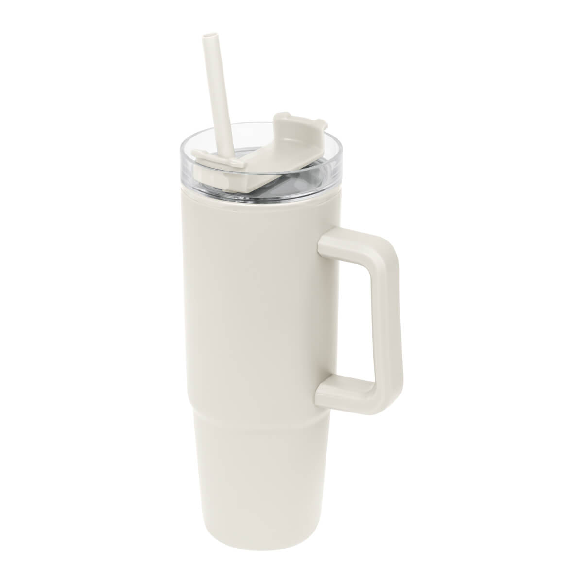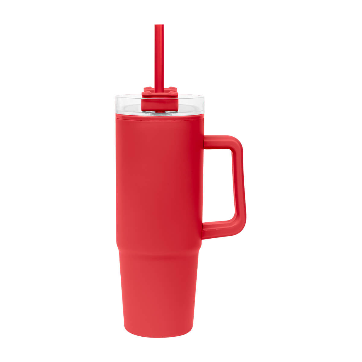 TERMO EDAN - De doble pared. Pared interna y externa de plástico. Tapa de plástico con cierre de rosca. Sobre tapa giratoria de plástico con opción para beber con popote o boquilla tradicional. Capacidad de 30 Oz. Base de 7 cm de diámetro. Incluye popote de plástico y caja individual.
