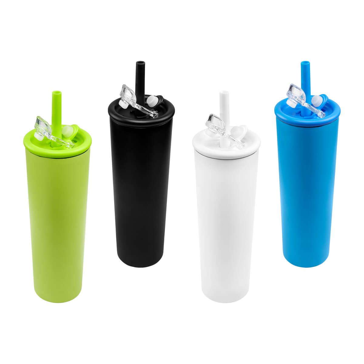 TERMO AELO - Termo doble pared. Cerrado al vacío. Pared interna y externa de acero inoxidable. Terminado rugoso que facilita su agarre. Tapa de plástico con cierre de rosca que le aporta mayor seguridad. Cuenta con dos funcionalidades en la tapa, boquilla para beber con sobre tapa push y ranura para popote con sobre tapa adicional. Popote con boquilla de silicón, avanzado sistema de cierre anti derrames. Mantiene tus bebidas calientes hasta 6 hrs. y frías hasta por 8 hrs. Capacidad de 25 Oz. Incluye caja individual.