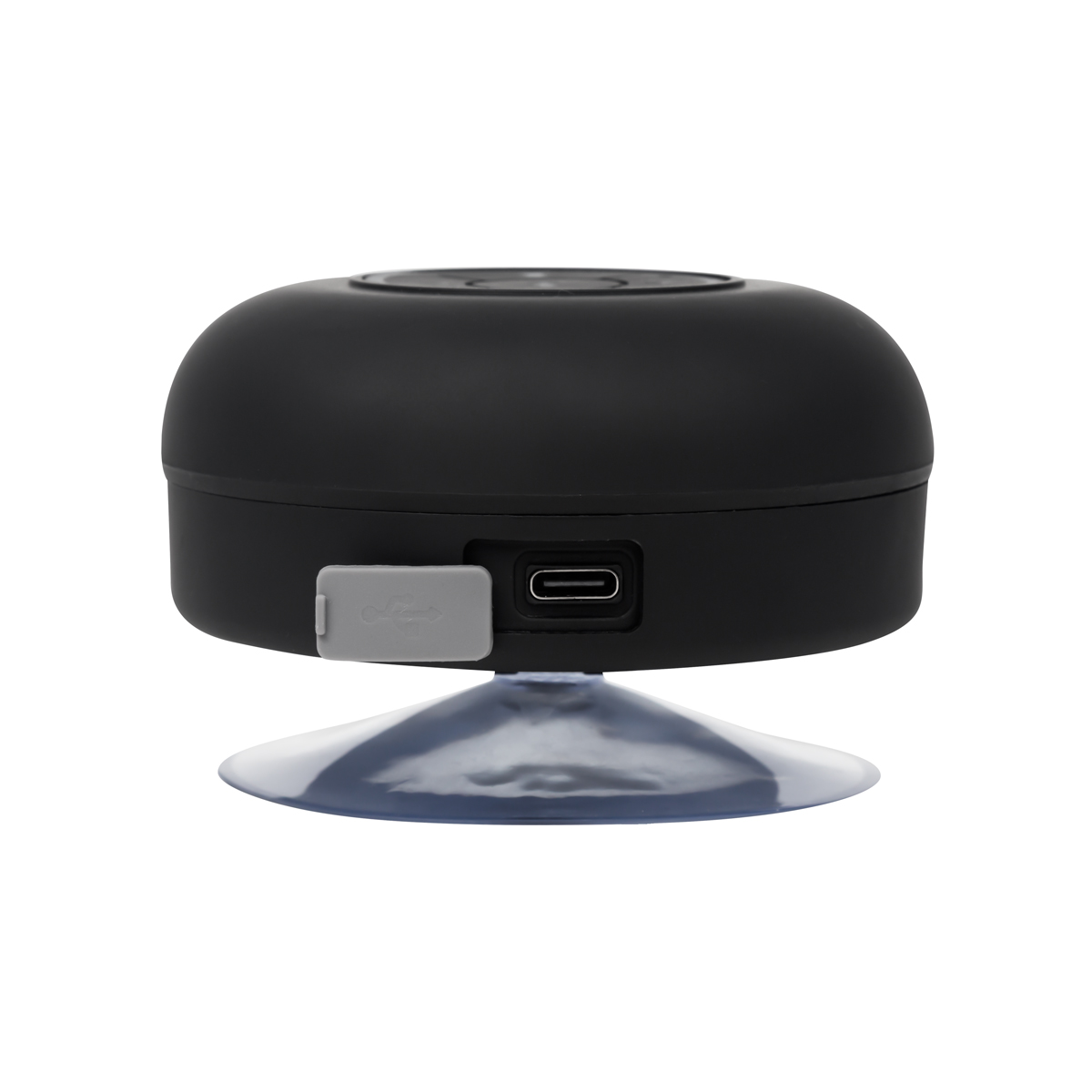 BOCINA TECHRA - Bocina bluetooth con batería recargable. Incluye luces LED con diferentes colores configurables. Resistente a salpicaduras. Ventosa de fuerte fijación para superficies lisas. Reproducción de música hasta 6 horas. Función manos libres. Controles de volumen, reproducción, micrófono y luces. Incluye cable cargador tipo C.