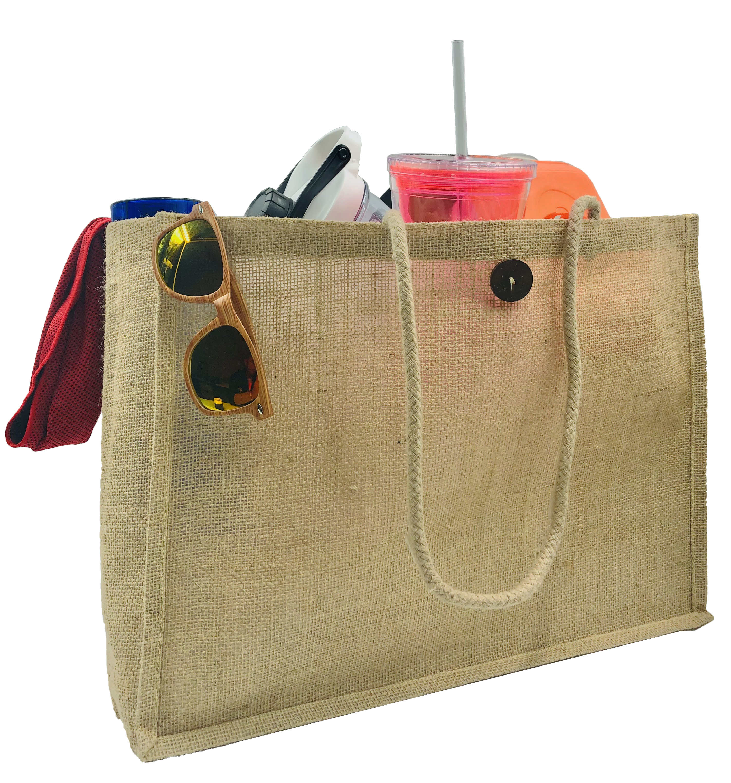 TAJ Bolsa de yute laminado con asas de bambú y asas de tela....