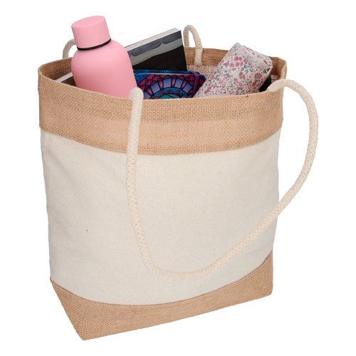ZICATELA Bolsa de yute y algodón con interior plastificado con asas y fuelle....