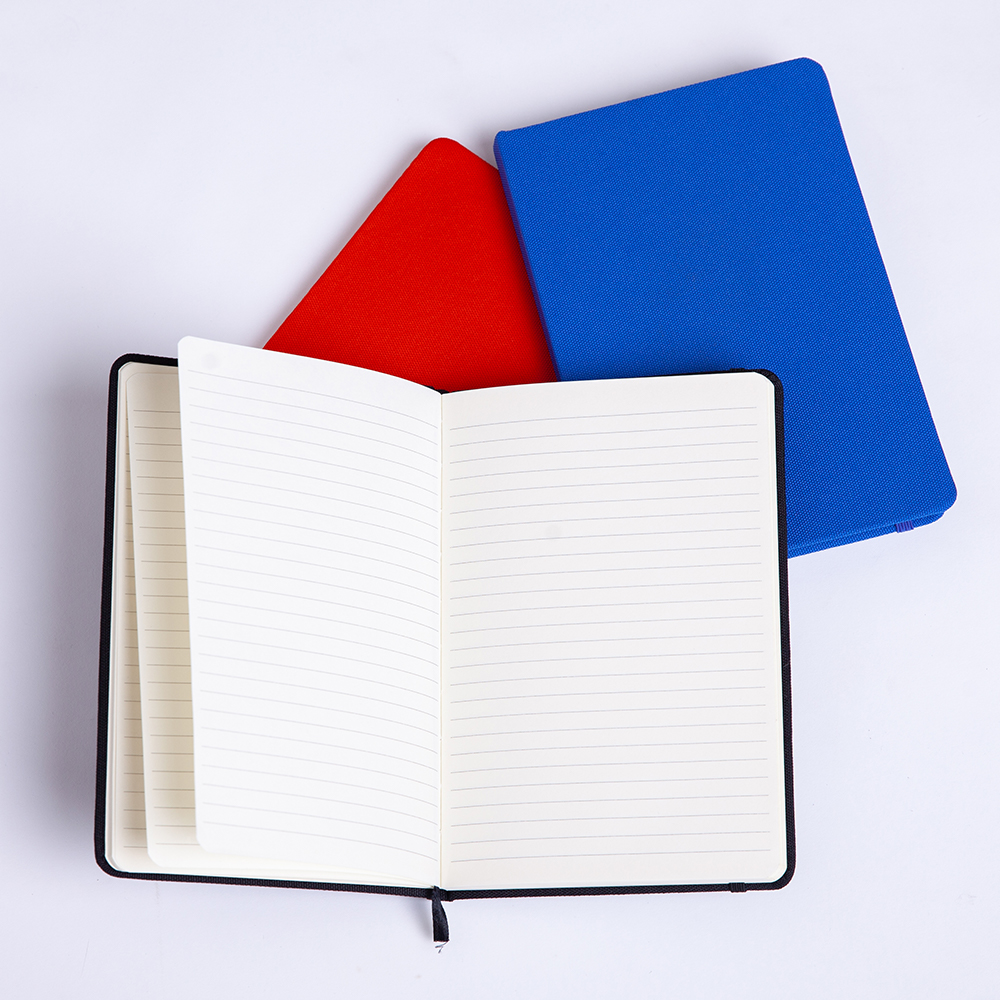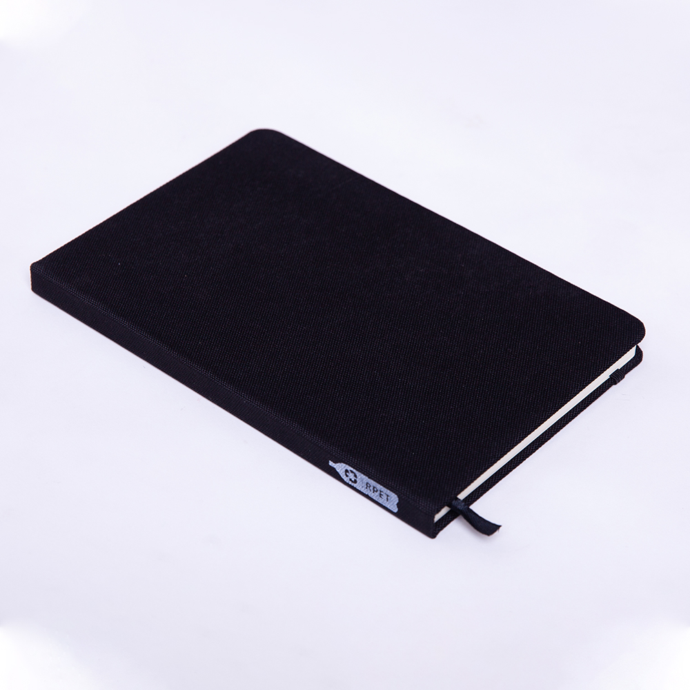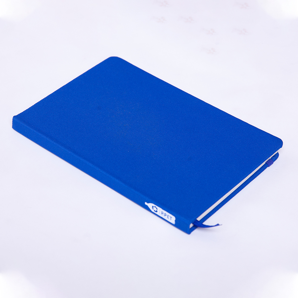 Libreta ecológica de pasta dura de Pet Reciclado, banda elástica y separador con 80 hojas rayadas.