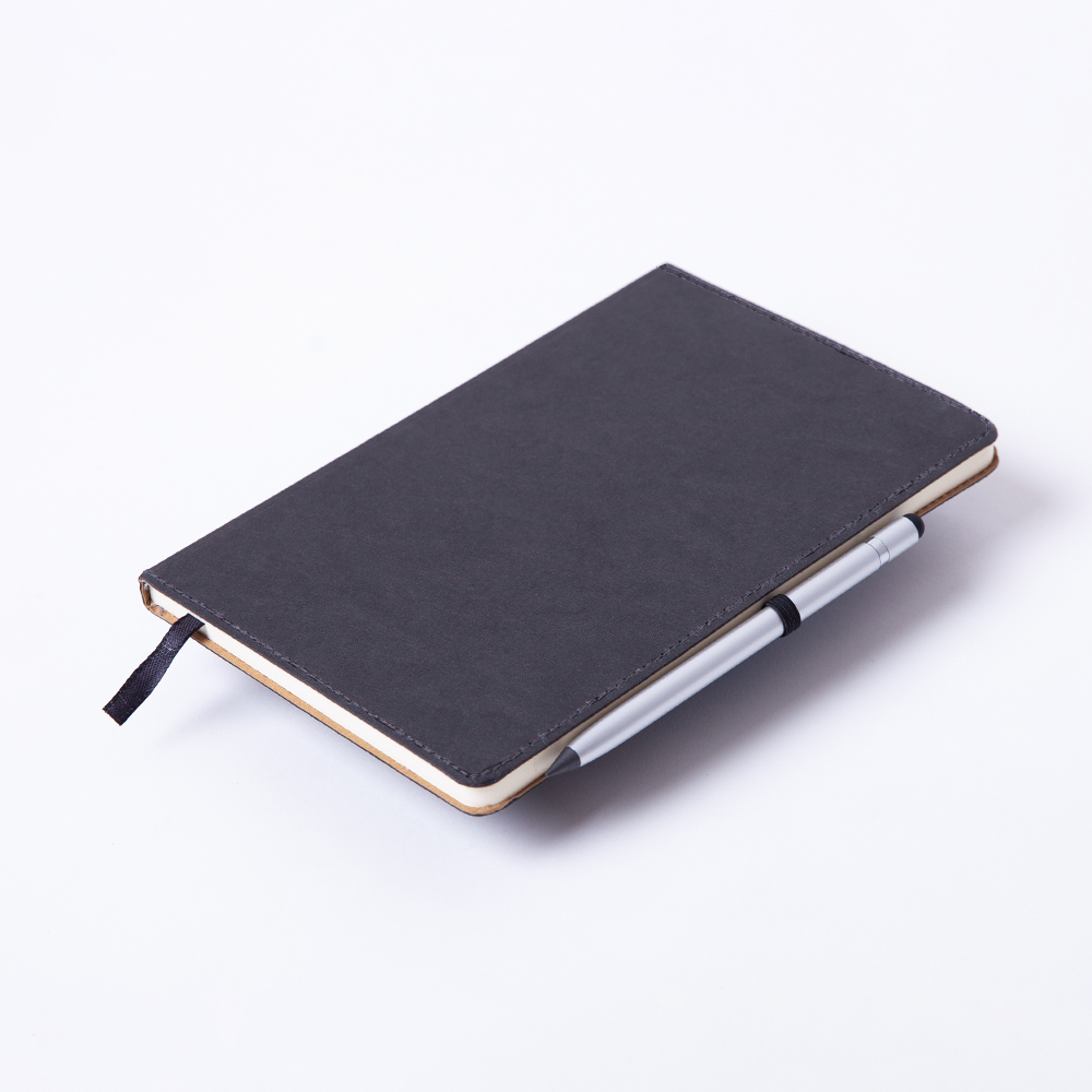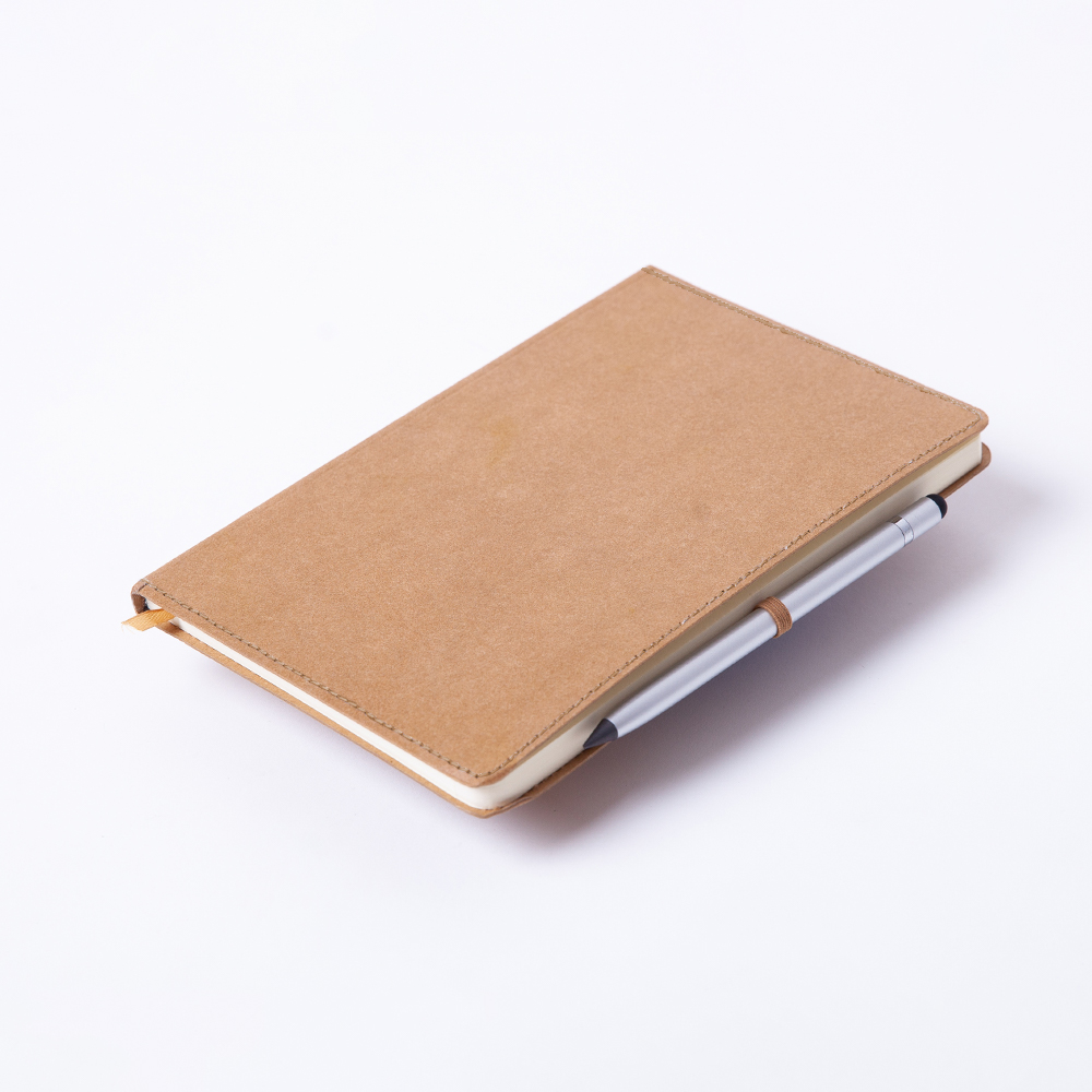 Libreta ecológica elaborada con cubierta dura de papel Kraft lavable. Porta bolígrafo y separador; con 80 hojas rayadas.