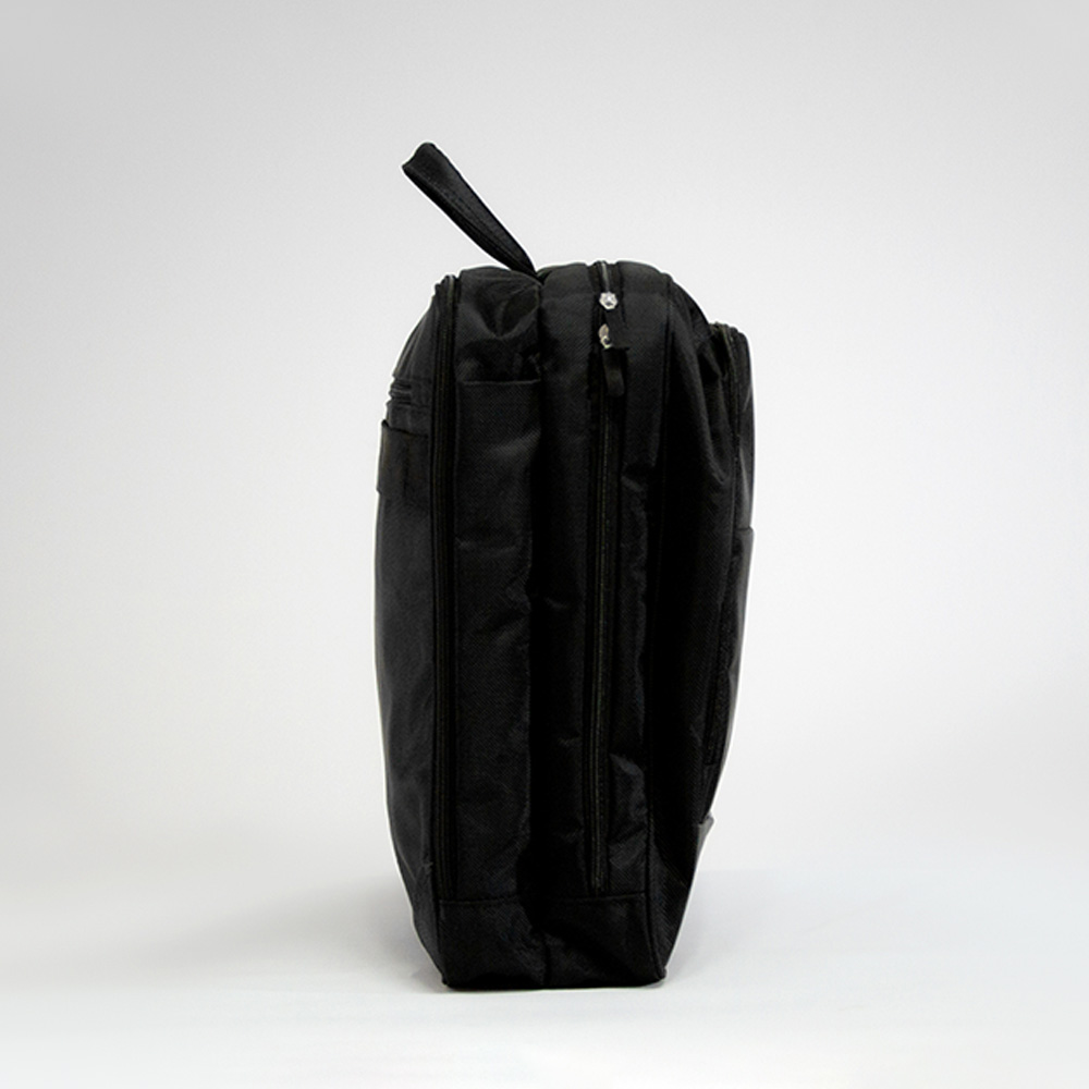 Mochila-Portafolio de poliéster. Bolsa frontal con compartimientos para bolígrafos, espacio para celular y power bank. Bolsa intermedia acolchada para laptop y bolsillos para accesorios. Bolsa portadocumentos y tablet. Bolsa posterior con cierre para guardar tirantes acolchados que se colocan para usarse como mochila. Asa ajustable y desmontable al hombro para usarse como portafolio. Incluye salida de audífonos y placa metálica.