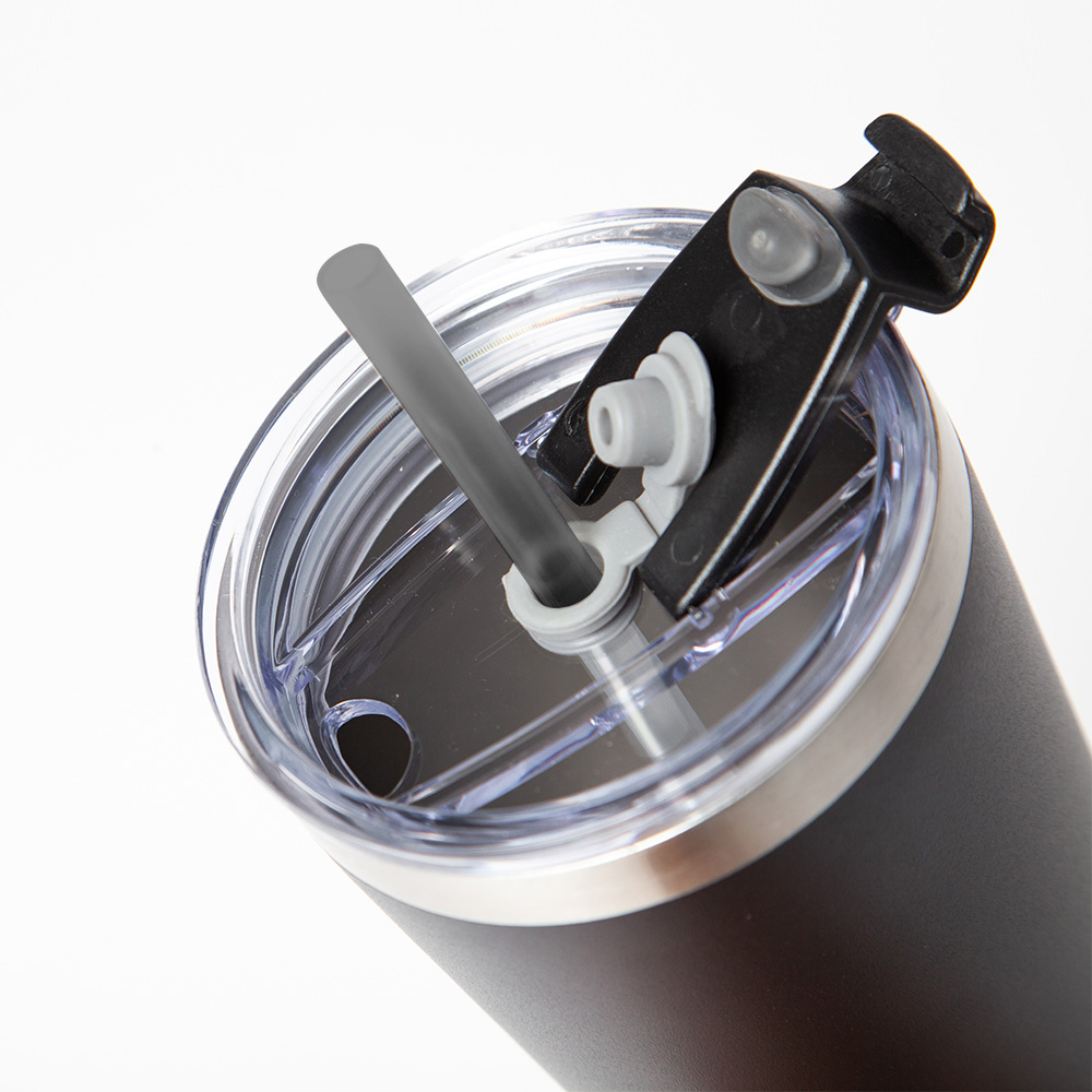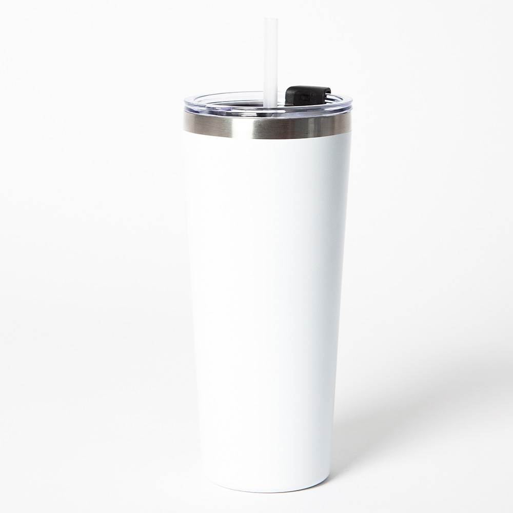 Termo de acero inoxidable de doble pared insulada al vacío para mantener las bebidas frías o calientes por más horas. Terminado arena, tapa anti derrames, popote y tapa cubre popote con capacidad de 650 ml. Certificación FDA.