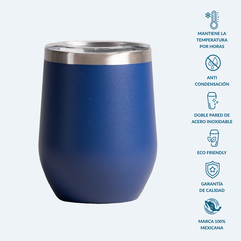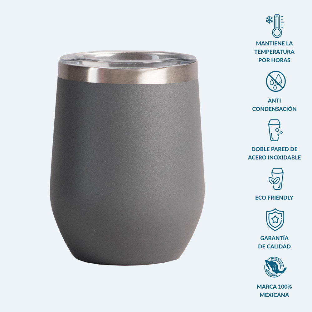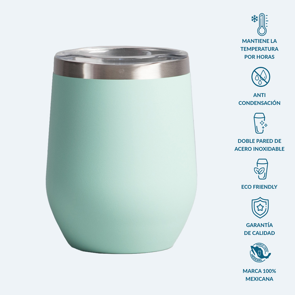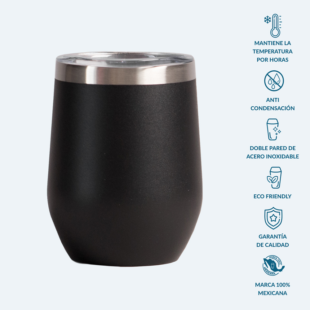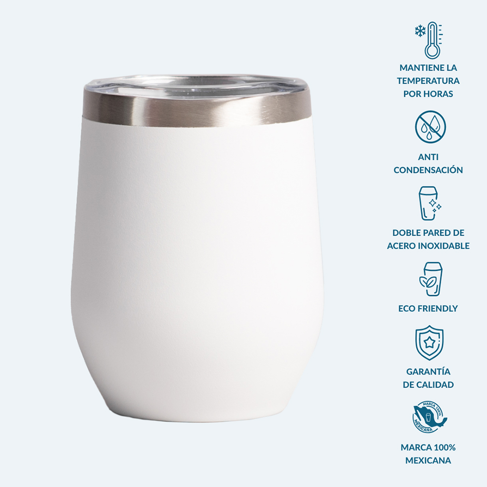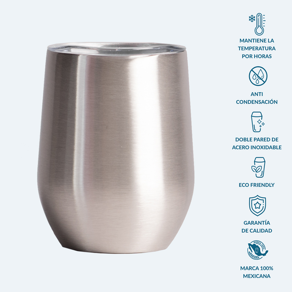 VASO PARA VINO 12 oz Vaso para vino fabricado con acero inoxidable de grado cocina libre de BPA, cuenta con una doble pared grado 18/8 anti condensación, la cual permite mantener la temperatura ideal de tu bebida hasta el último trago, aislando el calor y el frío del ambiente. Su composición de alta calidad lo vuelve resistente a la perforación y corrosión, brindado un producto de alta durabilidad. Producto de fácil lavado, permitido en lavavajillas. Capacidad 355 ml.