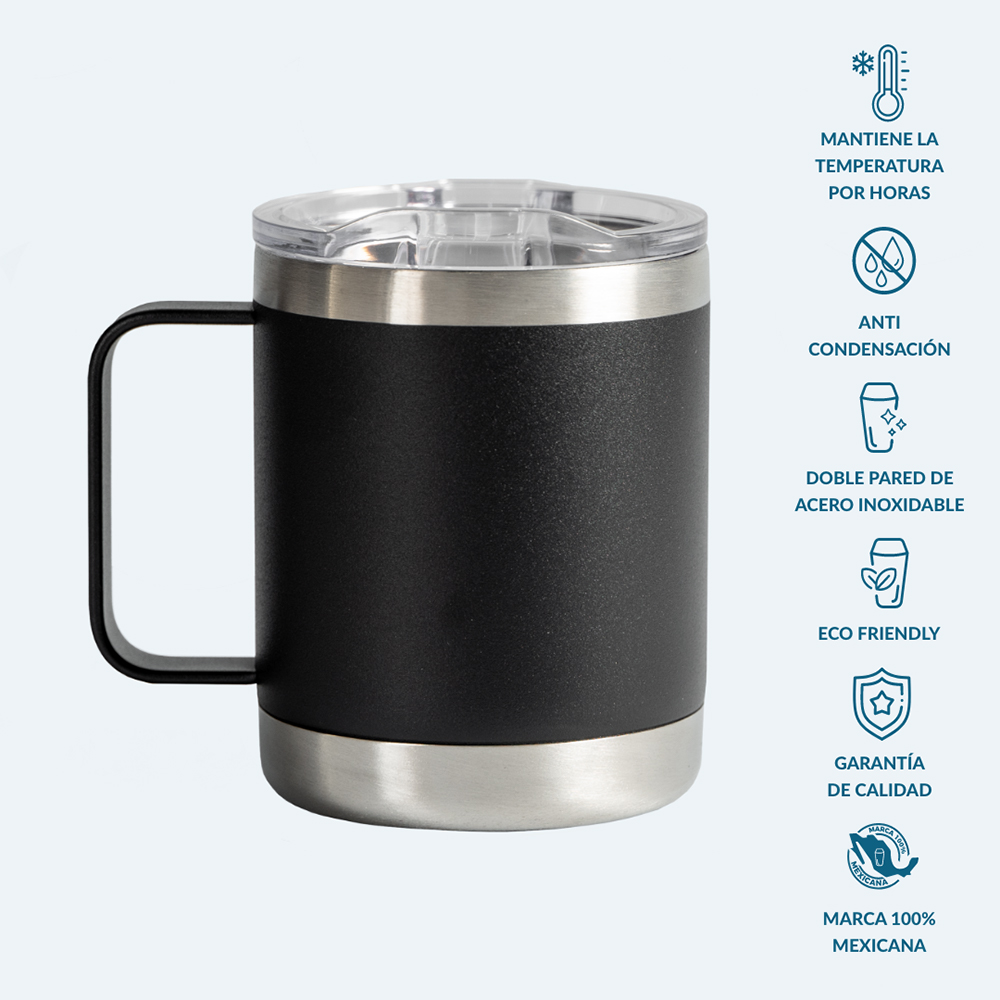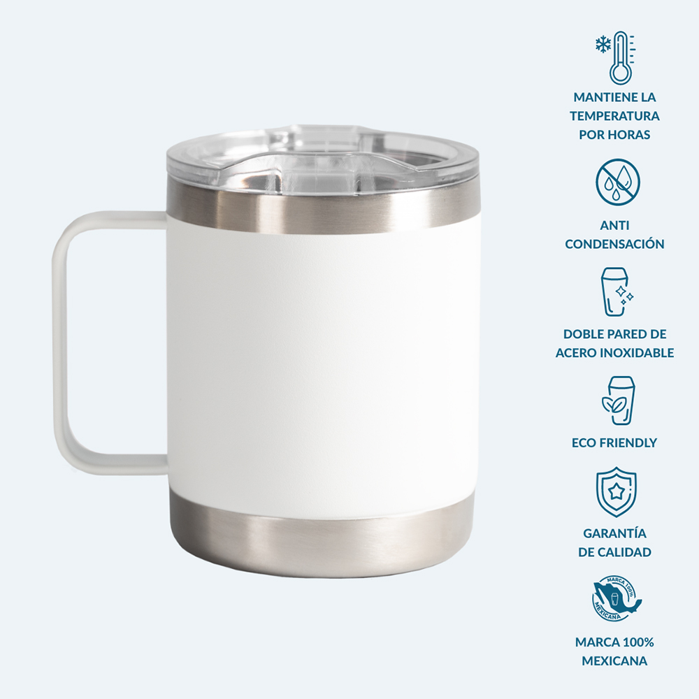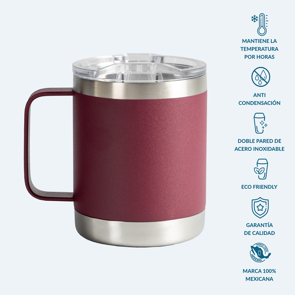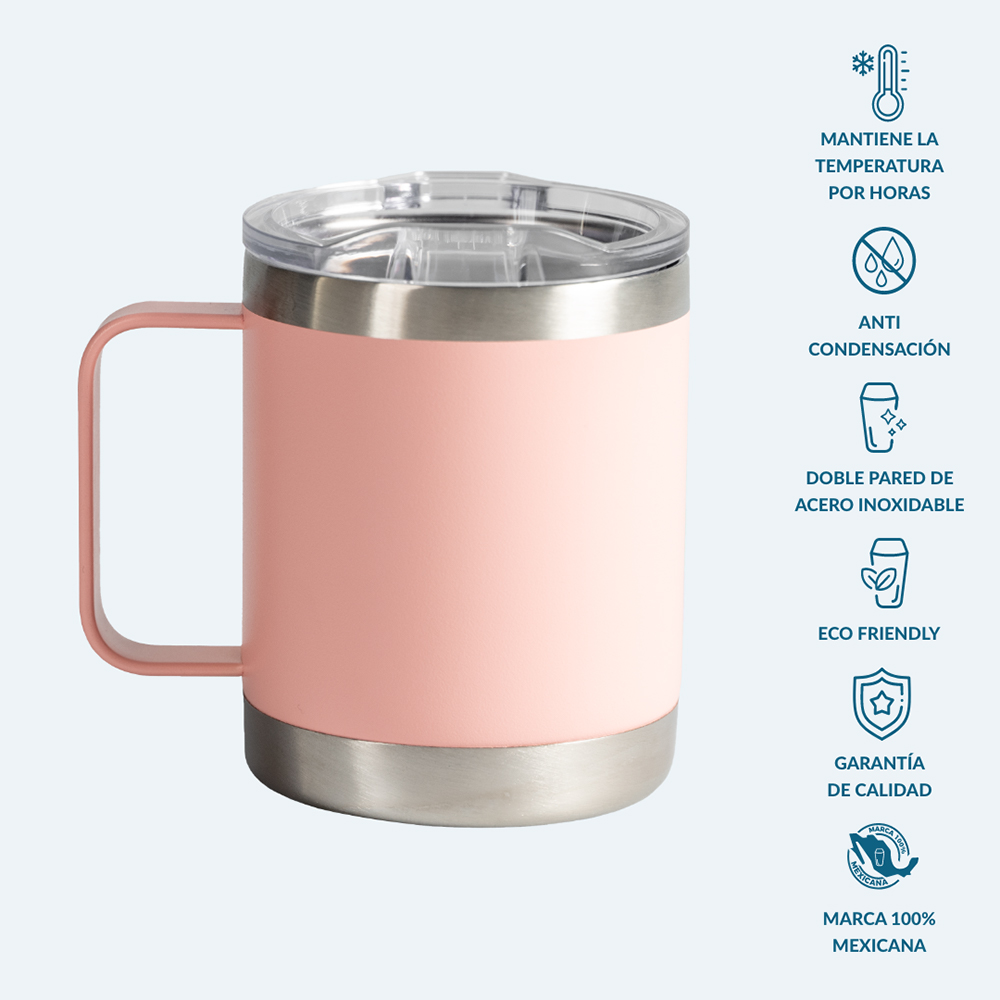 Taza de acero inoxidable con grado cocina libre de BPA, cuenta con una doble pared grado 18/8 anti condensación, la cual permite mantener la temperatura ideal de tu bebida hasta el último trago, aislando el calor y el frío del ambiente. Su composición de alta calidad lo vuelve resistente a la perforación y corrosión. Producto de fácil lavado, permitido en lavavajillas. Capacidad 355 ml.