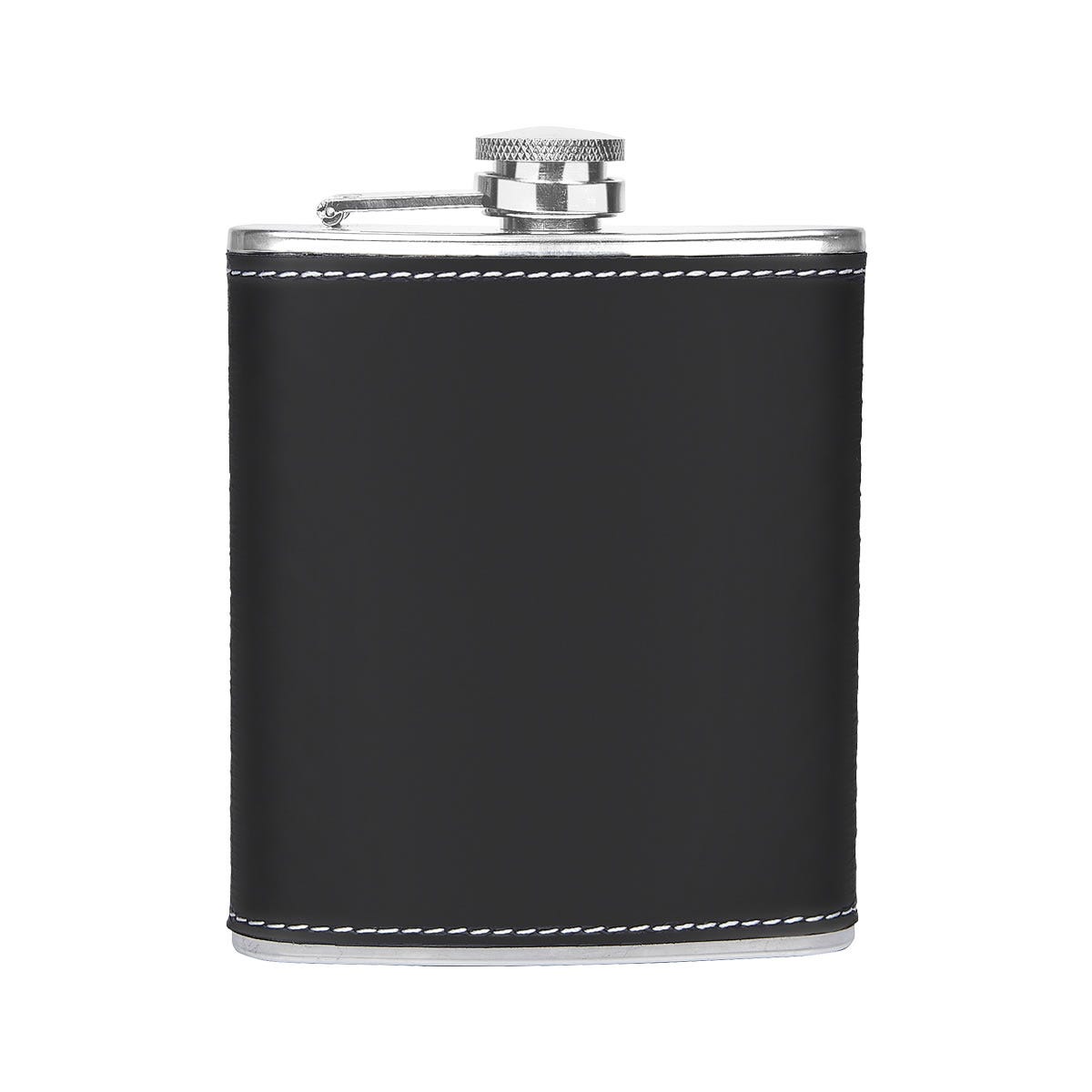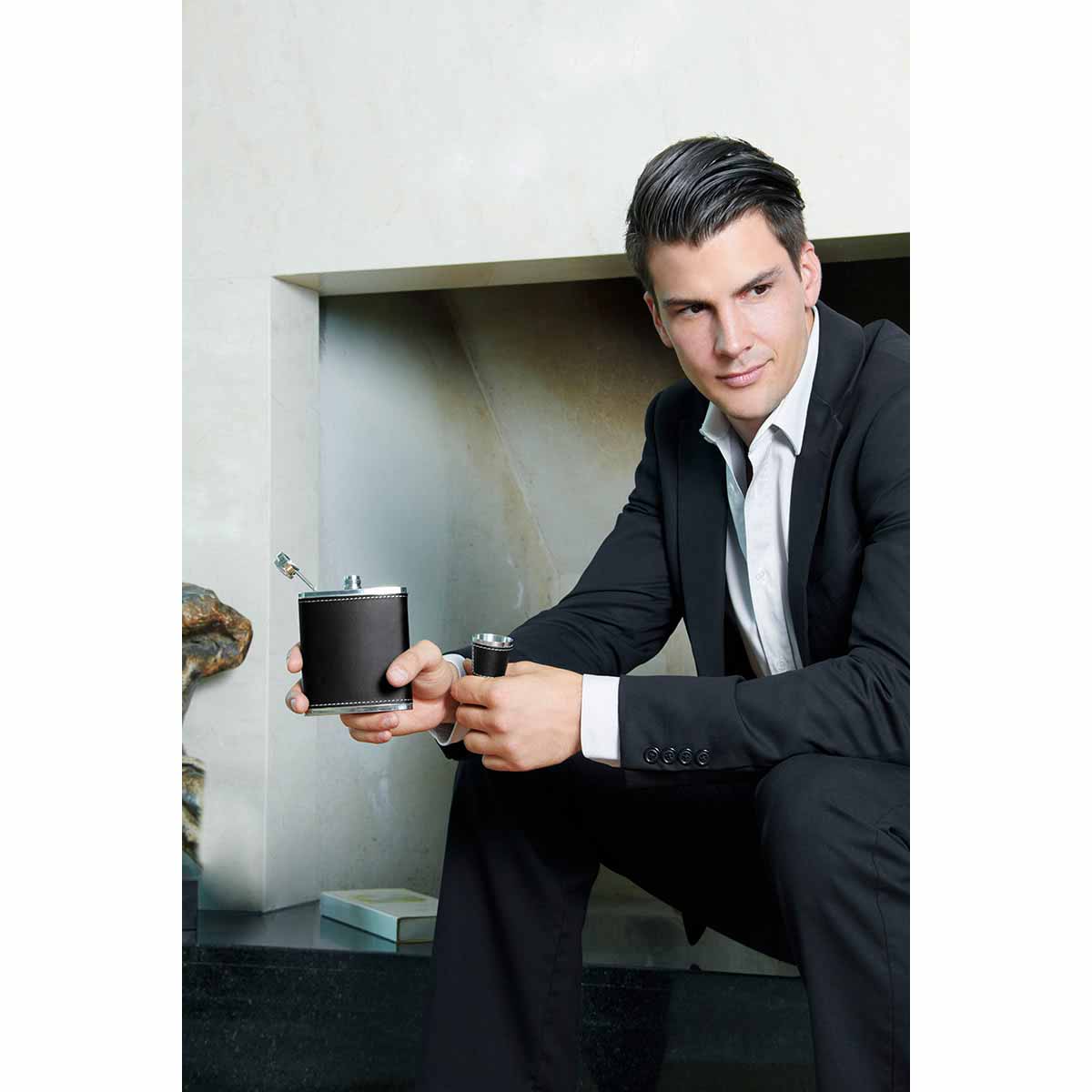 LICORERA BRISTOL - Set de licorera con tapa de rosca para evitar derrames, 2 vasos metálicos con manga de curpiel, 1 embudo y caja de regalo.