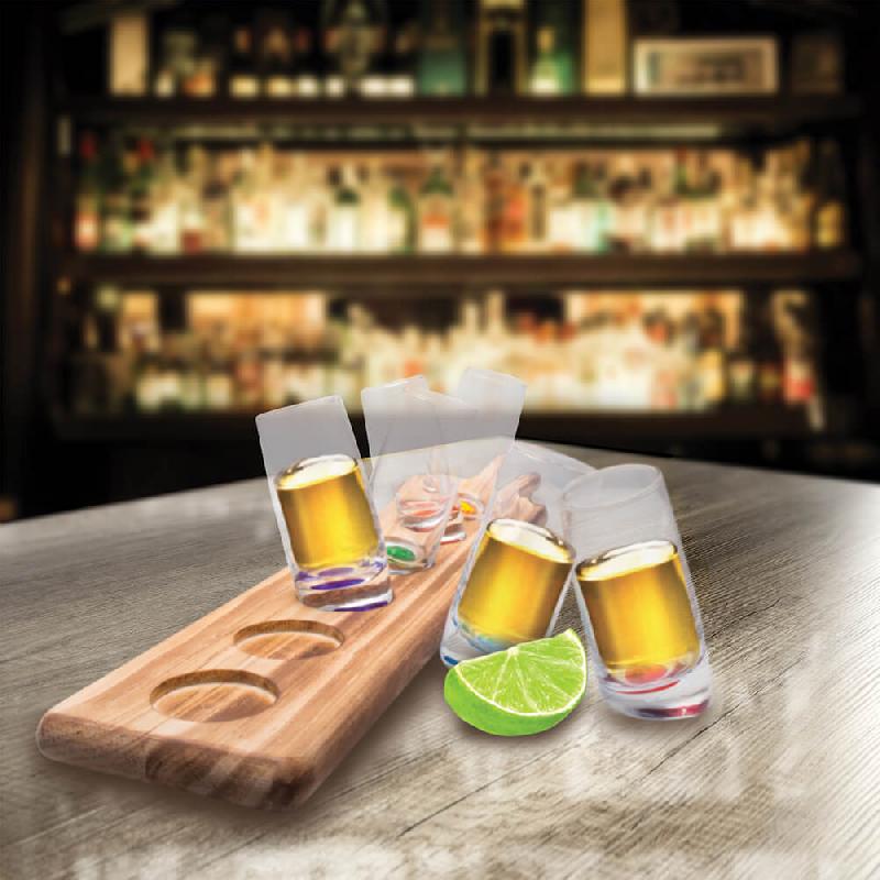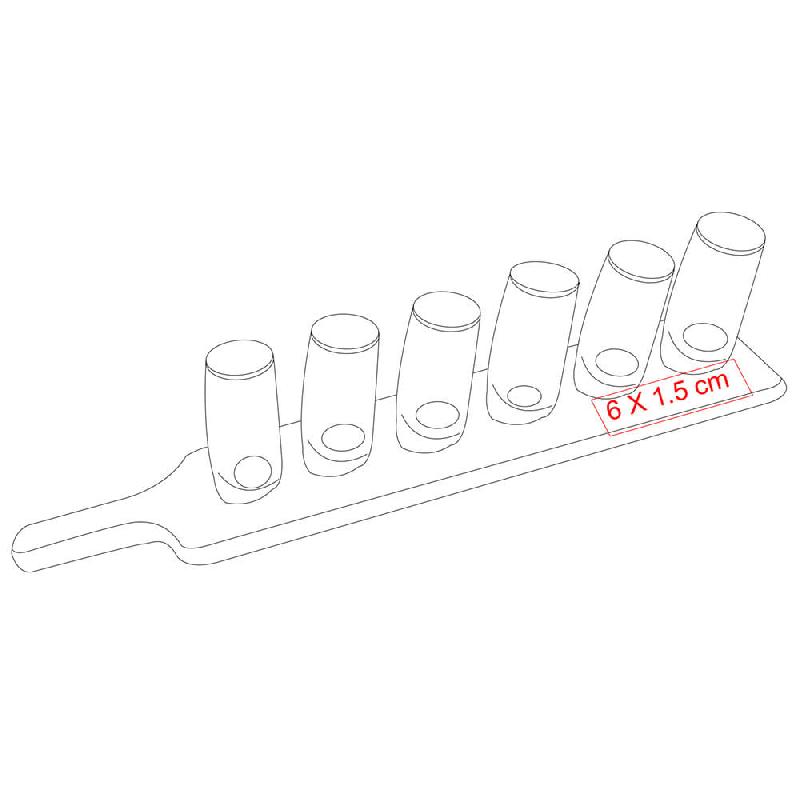 Set de 6 vasos tequileros de 3 oz cada uno. Medidas: 49 cm x 10 cm Material: Cristal y madera. Empaque: Caja de cartón.