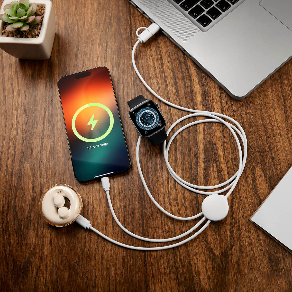 CABLE KANSAS - Cable cargador 5 en 1. Incluye conector de entrada USB y tipo C, conector de salida lightning (8 pines), micro USB, tipo C y cargador inalámbrico para reloj inteligente (compatible con dispositivos que cuenten con tecnología de carga inalámbrica). Este cable multifunción, permite cargar varios dispositivos simultánemanete, lo que te ayuda a ahorrar tiempo y espacio. No admite la transferencia de datos.