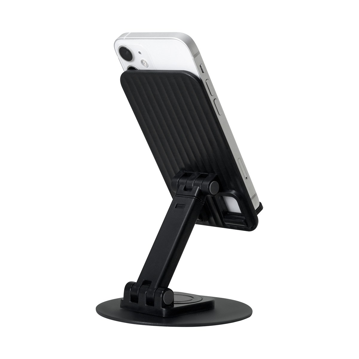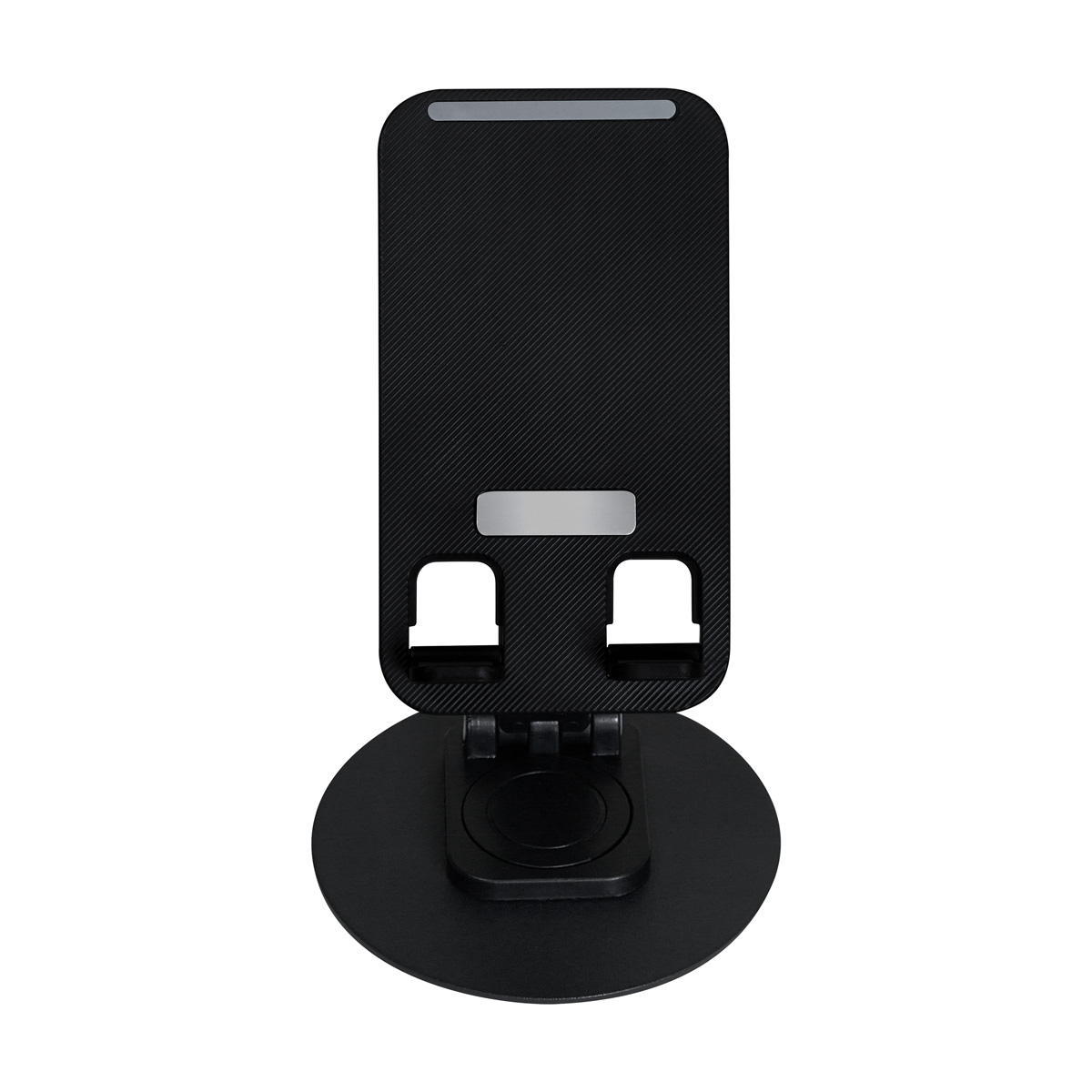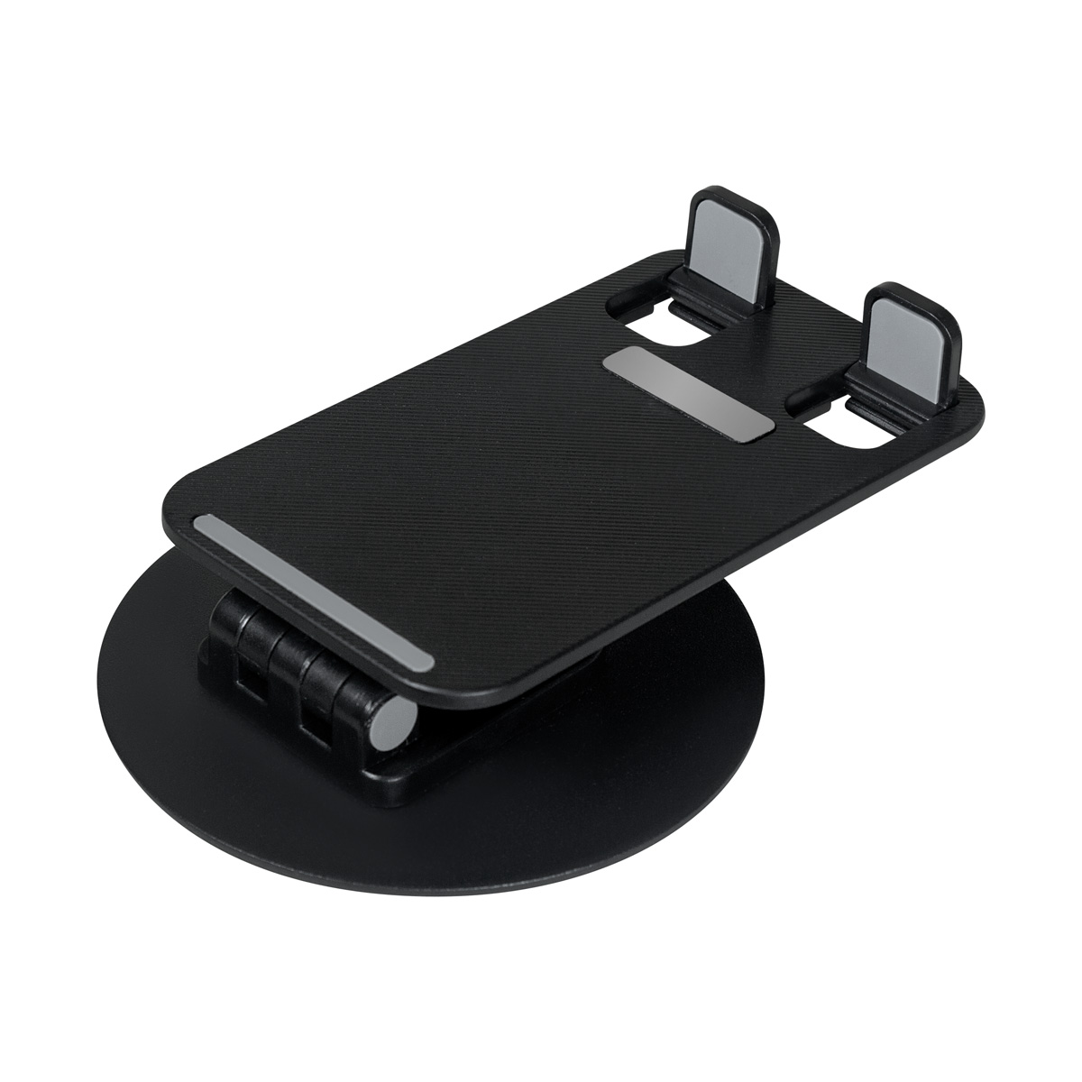 SOPORTE BAKÚ - Soporte universal con diseño plegable. Incluye una base giratoria de 360° que permite un fácil ajuste y personalización, lo que garantiza un ángulo de visión cómodo para el usuario. Desplegable a una altura máxima de 20 cm. Incluye caja individual.