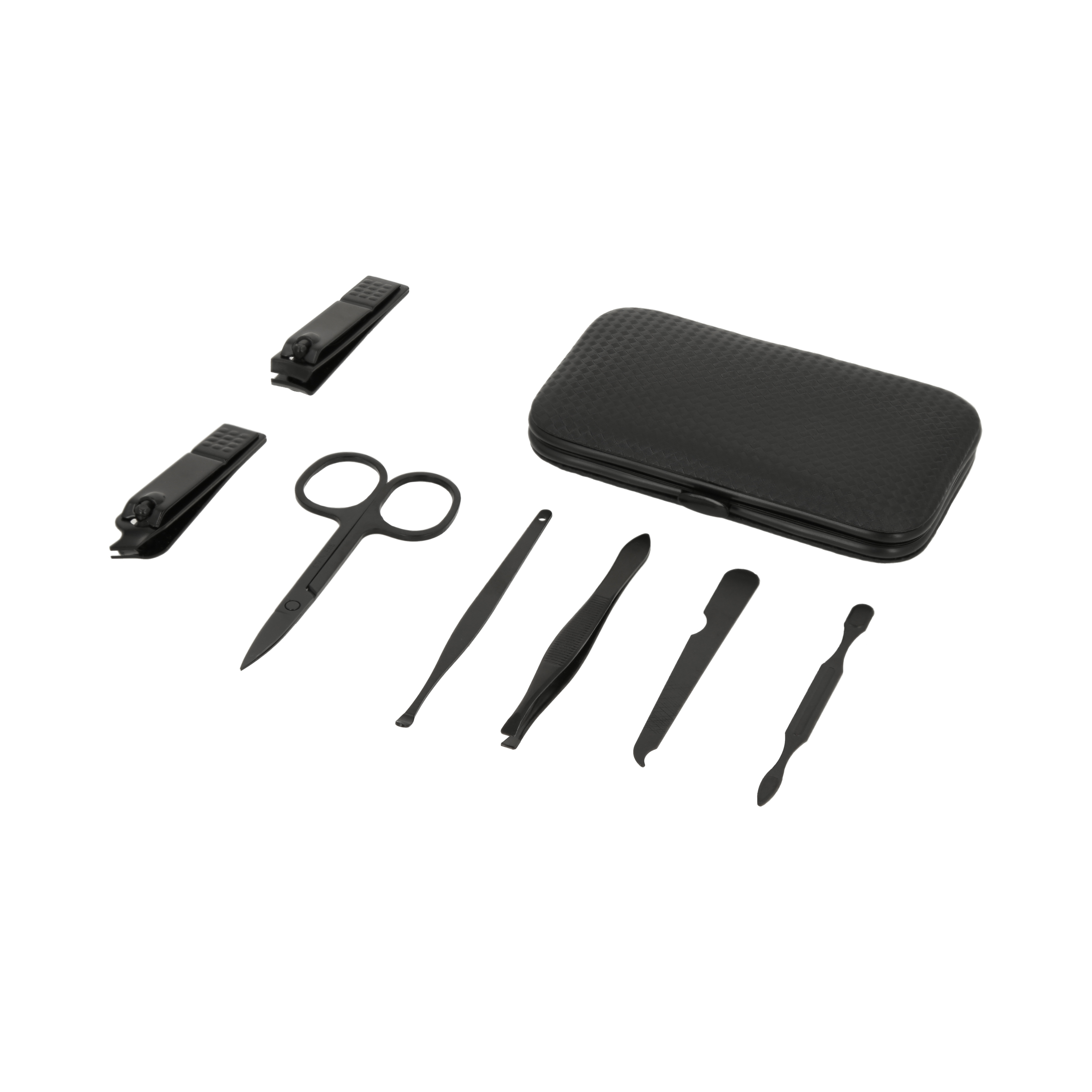 NAIL Set de manicure en estuche tipo gamuza con cierre que incluye: pinzas para depilar, tijeras, empujador de cutícula, lima, cortauñas y limpiador de oidos.
