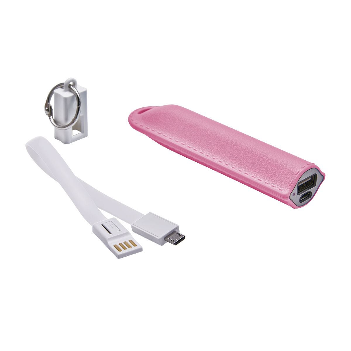 POWER BANK TAFEL - Batería auxiliar para smartphone, capacidad 2,600 mAh. Textura tipo piel. Puerto USB y micro USB. Contiene indicador de carga de 1 LED y cable micro USB de silicón con argolla.
