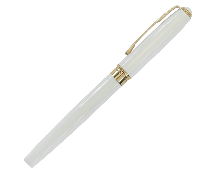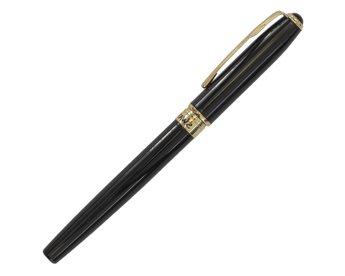 MAJESTIC - Bolígrafo metálico tipo roller de tinta alemana, con clip y detalles bañados en oro de 18 kilates. Cuenta con tapa que cierra a presión y repuesto especial con rosca para sujetarse firmemente. Presentación: caja en color negro.