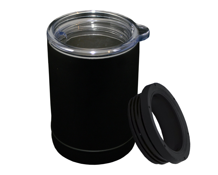 CROP - Termo y porta lata de acero inoxidable 304, con doble pared insulada al alto vacío para preservación de frío por 24 hrs. y calor por 6 hrs. Por medio de la tapa de rosca tipo anillo en negro, se puede sujetar la lata, para evitar que se resbale. Para bebidas calientes, cuenta con una segunda tapa de rosca color transparente. CAP. 360 ml. Presentación: caja en color blanco.
