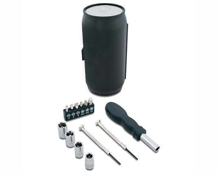 DARK - Juego de herramientas en forma de lata. Incluye: desarmador, extensión, 5 puntas de desarmador, 4 dados y 2 desarmadores de relojero. Presentación: caja en color negro.