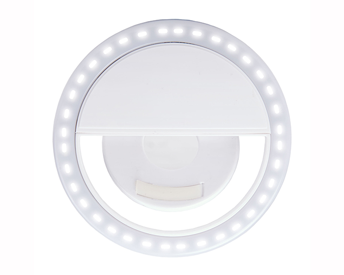 SMILE - Aro de luz LED para tomar selfis. Cuenta con 3 variaciones de luz. Brinda aproximadamente 60 minutos de luz continua. Incluye cable de carga USB. Presentación: caja en color blanco.