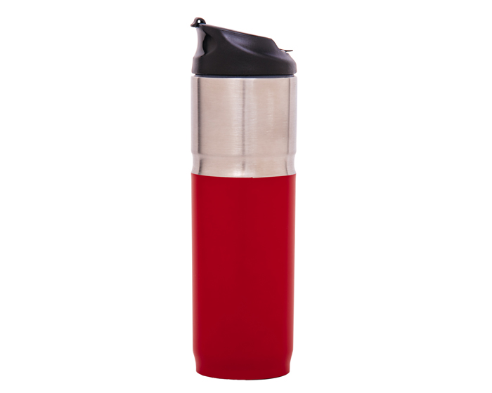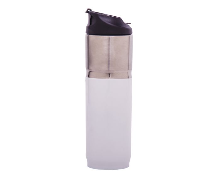 FRED - Termo de acero inoxidable de doble pared, con exterior en color plata arriba y de color mate abajo. Tapa de rosca hermética anti derrames con hendidura para popote. Mantiene bebidas calientes por 3 hrs. y frías por 6 hrs. Incluye popote de plástico transparente. CAP. 480 ml. Presentación: caja en color blanco.