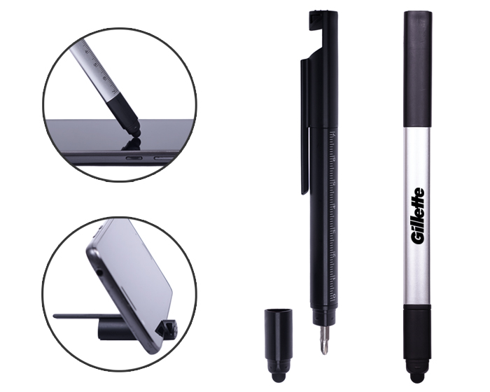 RIDER - Bolígrafo de plástico 5 en 1, diseño de cuerpo triangular que cuenta con regla de 7 cm. Punta touch para pantallas táctiles. Se puede utilizar como desarmador incluye 2 puntas plano y de cruz que se fija y guarda en el cuerpo de la pluma. Tapa extraíble diseñada para usarse como base de teléfono celular.