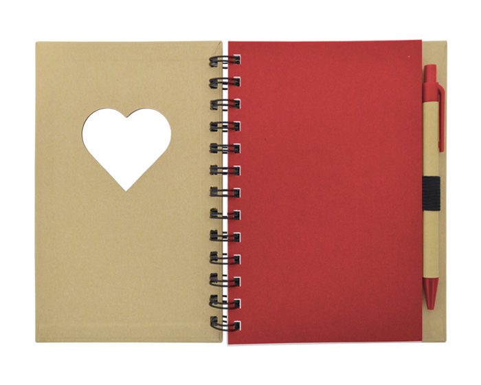LOVELY - Libreta ecológica de cartón con espiral metálico, 70 hojas rayadas, cinta elástica porta bolígrafo y bolígrafo de catón. La portada cuenta con suaje en forma de corazón.