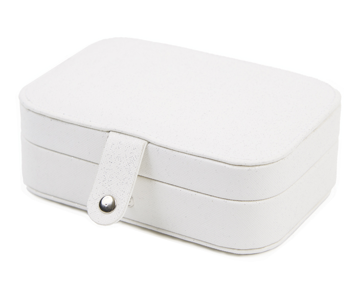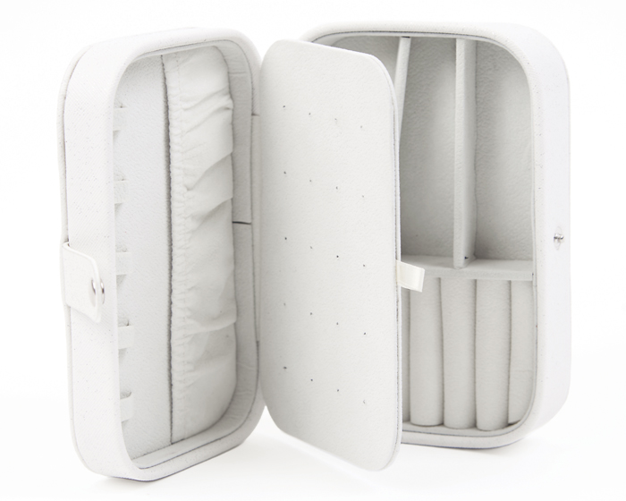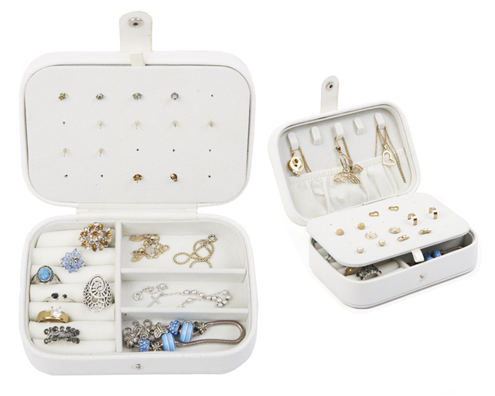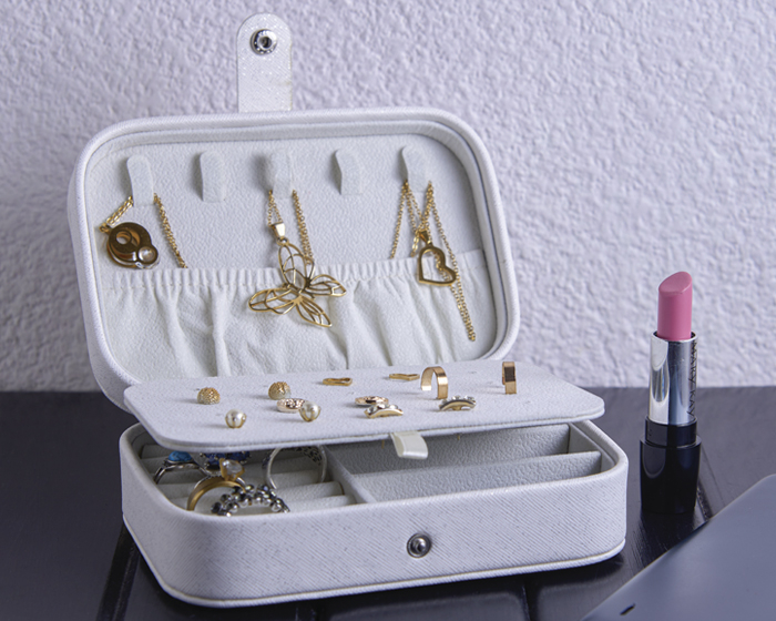 ÁMBAR - Estuche organizador de joyas. Cuenta con 5 ganchos para colgar collares o pulseras, bolsa interna con elástico, panel en la parte intermedia, ranuras y compartimentos para diversos accesorios. Cierre con broche a presión.