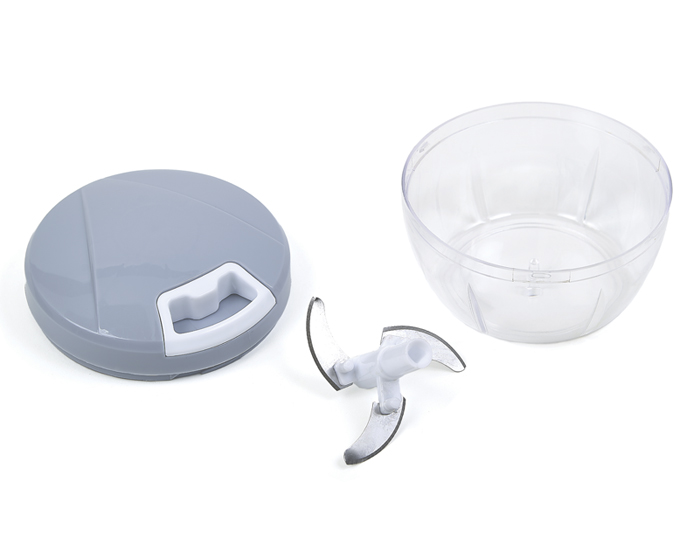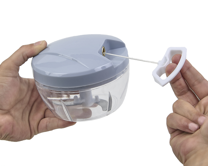 TRITURE - Triturador de alimentos con cuerda manual, recipiente de plástico, tapa enroscable y aspa de acero inoxidable. Presentación: caja en color blanco.