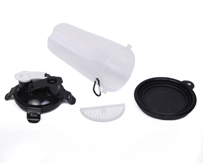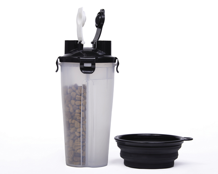 PET KIT - Recipiente para mascotas con 2 compartimentos: 1 para alimentos secos, y otro para agua, cuenta con tapa de 4 broches y 2 boquillas para servir, rejilla de plástico para evitar mezclar los alimentos. Incluye plato de silicona plegable con arnés para colgar al recipiente. Cap. 350 ml. (líquido) / 12 oz (alimento).