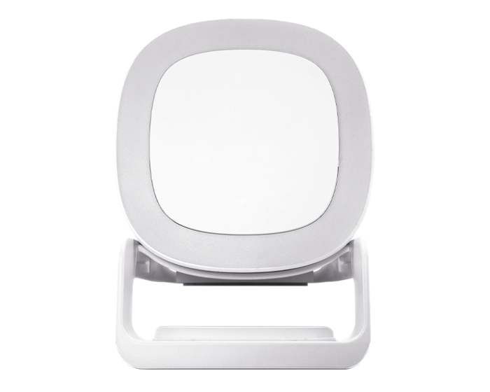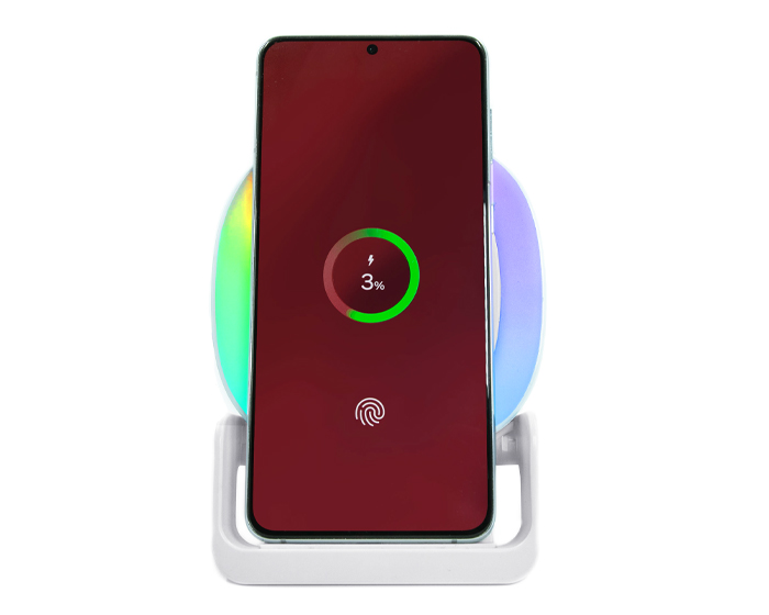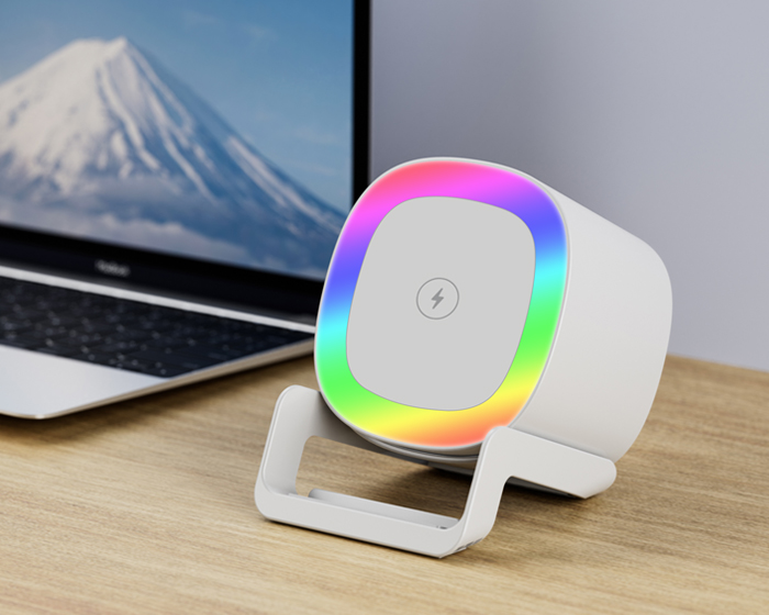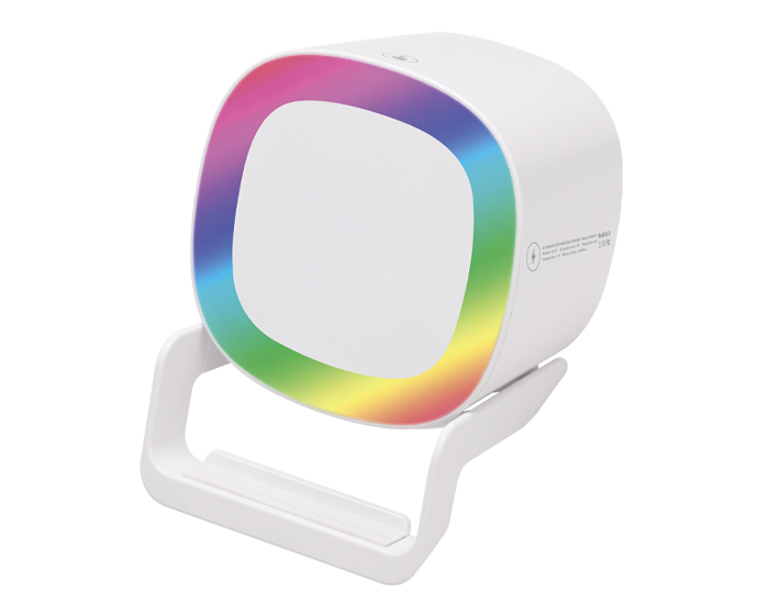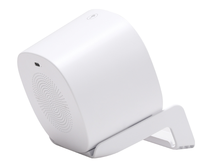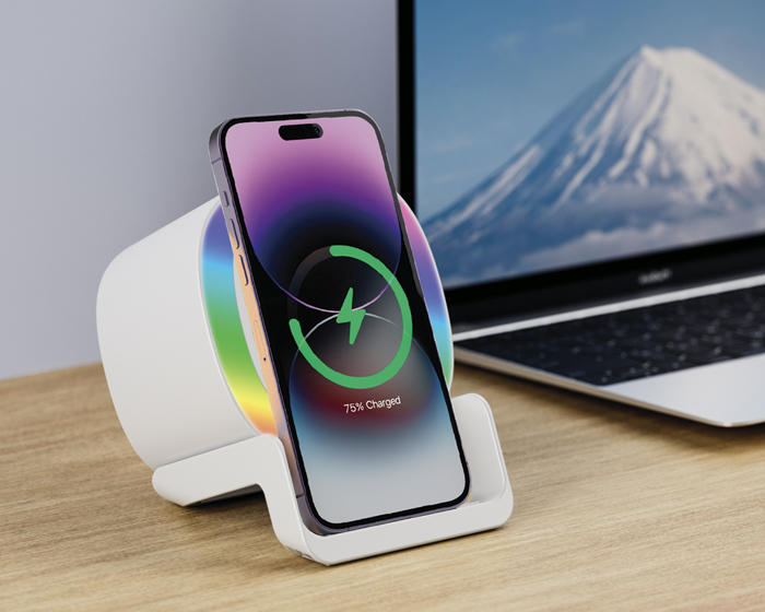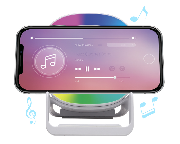 MILEY - Bocina Bluetooth portátil de carga rápida Qi (15W), cuenta botón touch para encender/apagar y cambiar la modalidad de la luz, luz LED multicolor, al grabar en láser en el centro de la bocina, destapa con luz LED. Cuenta con 2 bases como soporte para colocar el dispositivo móvil de manera vertical y horizontal, puerto de carga entrada tipo C. Incluye cable de carga. Compatible con dispositivos Android e iOS. Presentación: caja de regalo a color.