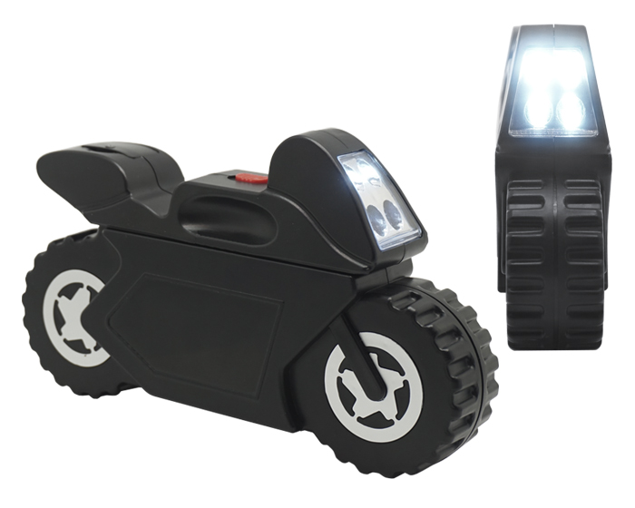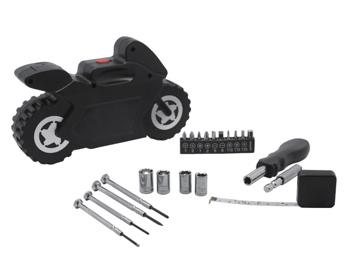 MOTOCROSS - Set de herramientas con luz LED en forma de motocicleta que incluye: 4 dados, desarmador con adaptador y extensión, 10 puntas, 4 desarmadores relojeros con imán y un flexómetro de 100 cms (1m). 4 baterías incluidas de botón. Presentación: Caja en color blanco.