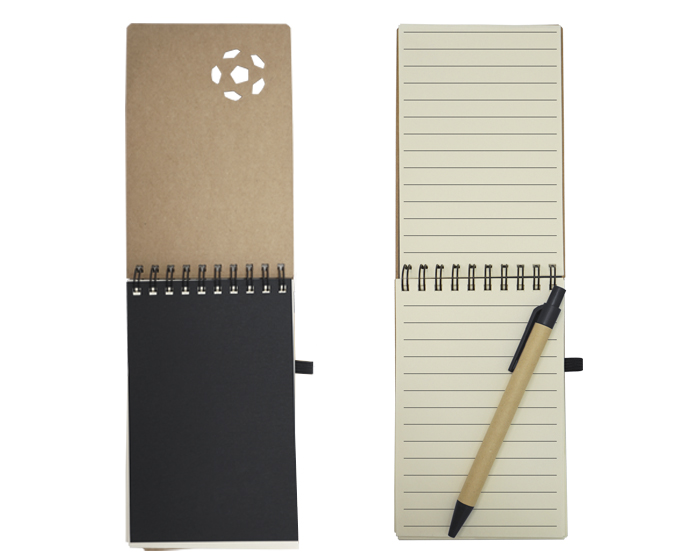 SCRIPT - Libreta ecológica de cartón con diseño de balón de fútbol, 70 hojas rayadas (140 páginas), espiral metálico color negro y cinta elástica. Incluye bolígrafo de papel con clip de plástico.