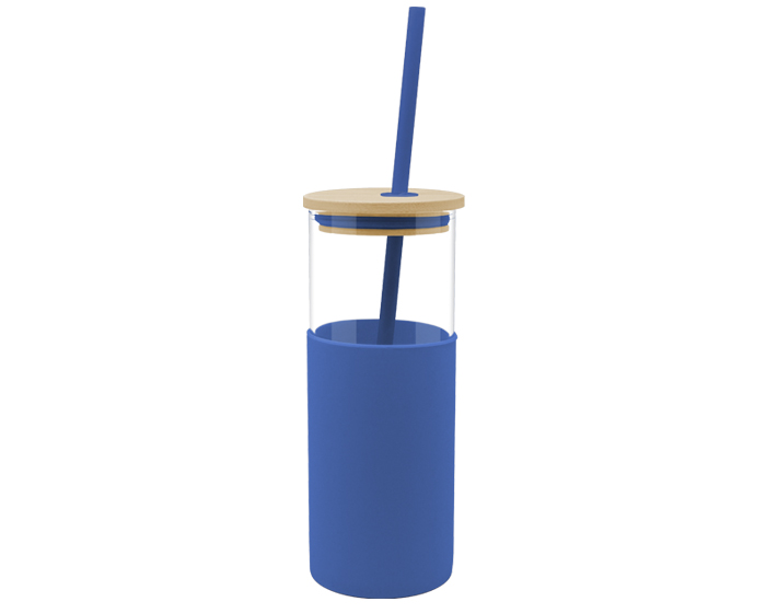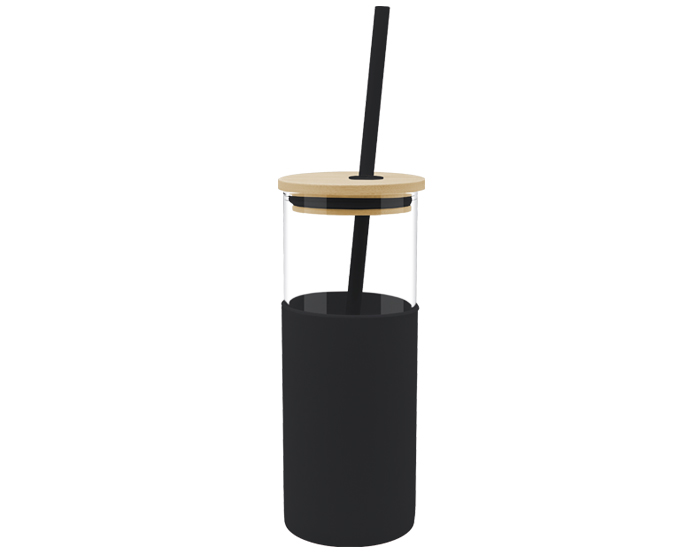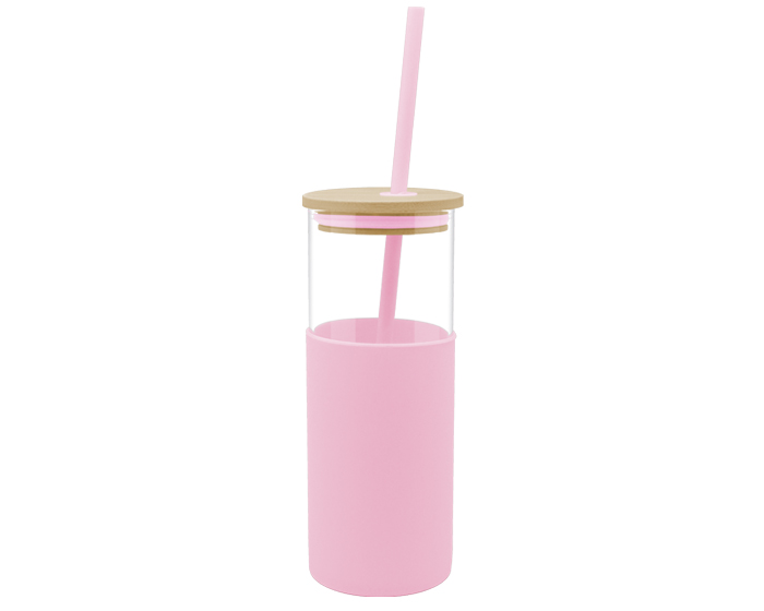 GLORY - Cilindro de vidrio de borosilicato con tapa de bambú a presión, cuenta con funda de silicón y popote de plástico en el mismo color. Incluye cepillo limpiador metálico para el popote. CAP. 500 ml.
