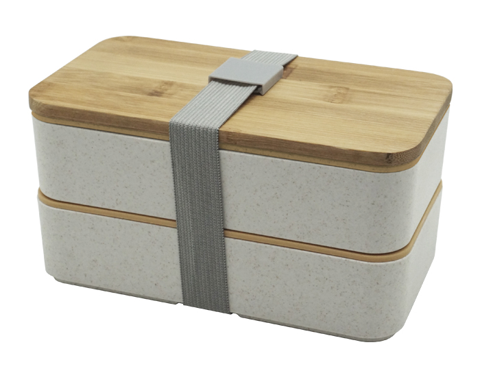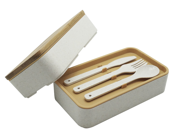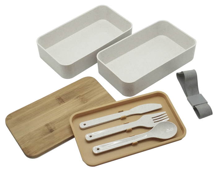 ROBLE - Box lunch doble de fibra de trigo con tapa de bambú que incluye: base divisora con 3 cubiertos (cuchara, tenedor y cuchillo), separador de alimentos y resorte de seguridad para fácil cierre.