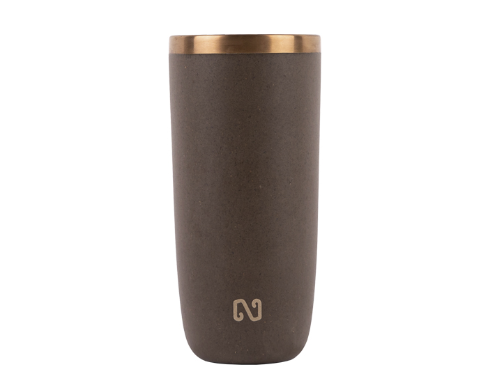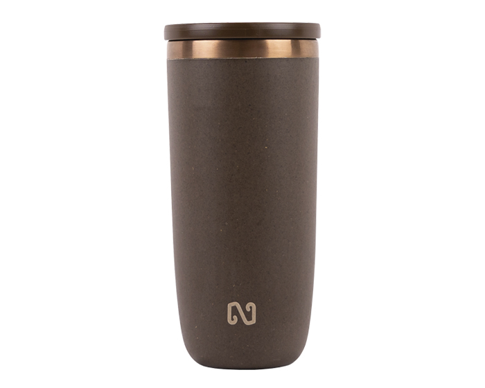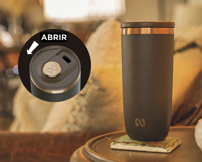 NAYAD NEO - TAPA DESLIZABLE - Termo NAYAD NEO de 16 Oz. de doble pared, la interna es de acero inoxidable y externa de granos de café reciclado. Mantiene bebidas calientes por 3 hrs. y bebidas frías 5 hrs. En la parte superior tiene un cintillo metálico color bronce que combina con el botón dorado de su tapa, que hay que deslizar hacia atrás para su fácil apertura. Cuenta con tapa hermética de rosca anti derrames y anti escurrimiento. CAP. 480 ml. (16 OZ). Presentación: Caja de color. * Libre de BPA.