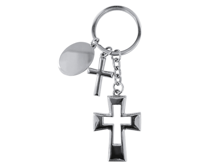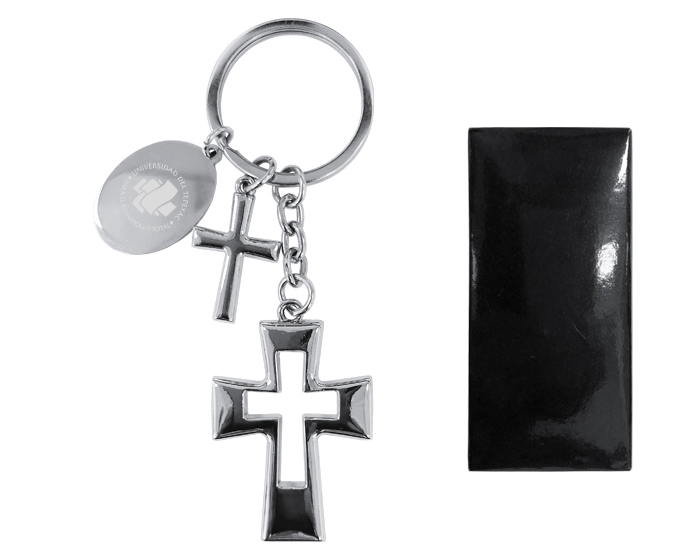 AMÉN - Llavero con 2 cruces y placa de aleación de zinc y arillo reforzado. Presentación: Caja individual de cartón en color negro.