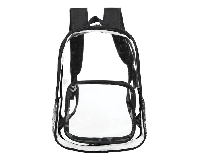 STUDENT - Mochila escolar de PVC transparente, con un compartimento frontal, bolsillos de malla laterales, asa superior y tirantes con correas ajustables.