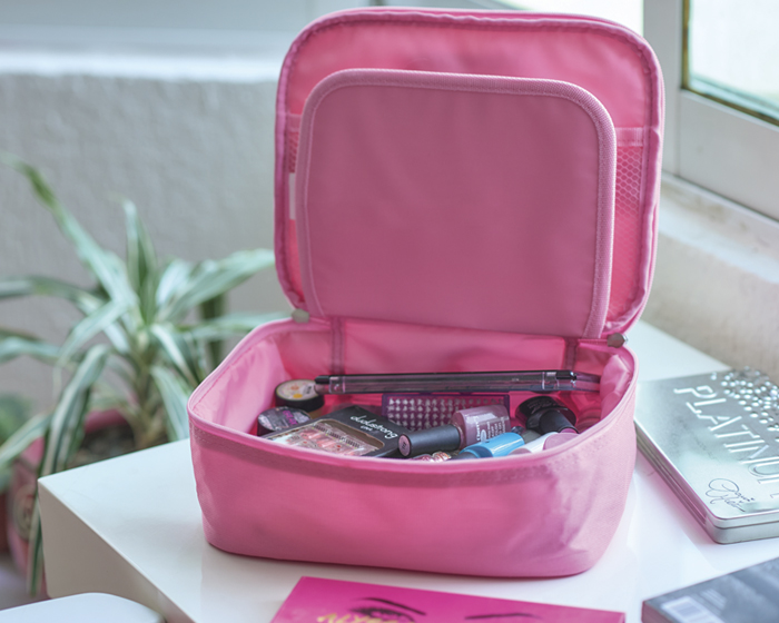 VISA - Organizador multiusos de poliéster que incluye: asa superior, 2 compartimentos de malla, 2 compartimentos intermedios con resorte y un compartimento amplio en la base para guardar.