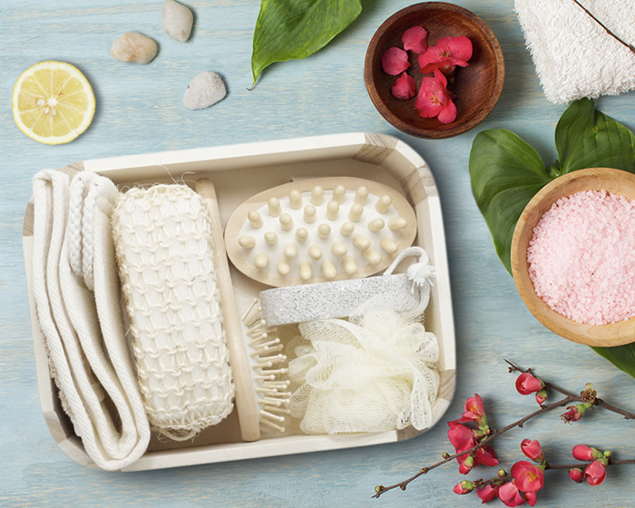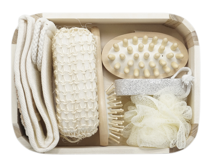 BEAUTY - Set de aseo y cuidado personal que incluye: esponja para baño, borla de baño con asa, toalla con agarraderas y compartimento para jabón, cepillo de madera, masajeador de madera con asa y piedra pómez con cordón. Incluye base de madera. Presentación: Caja en color blanco.