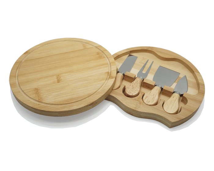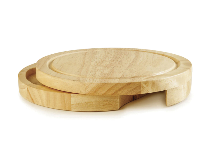 CAOBA - Tabla con asa de agarre giratoria para cortar queso y carnes frías. Cuenta con: cuchillo, espátula, tenedor y cortador con mango de madera. Presentación: caja en color blanco.