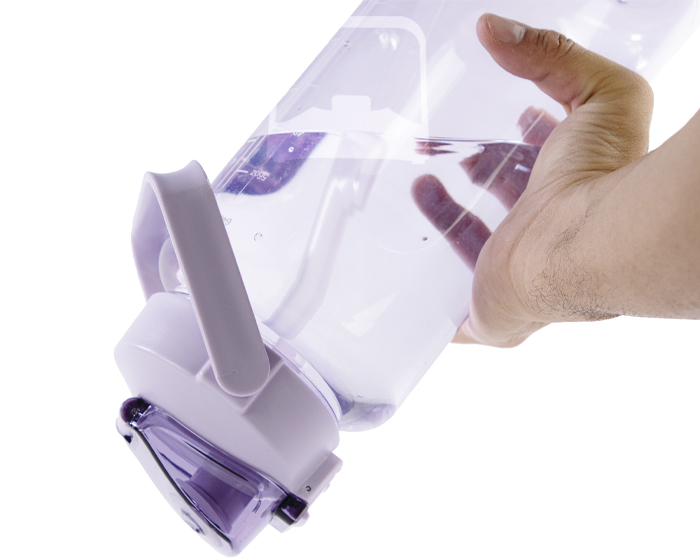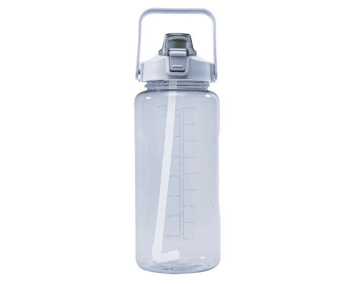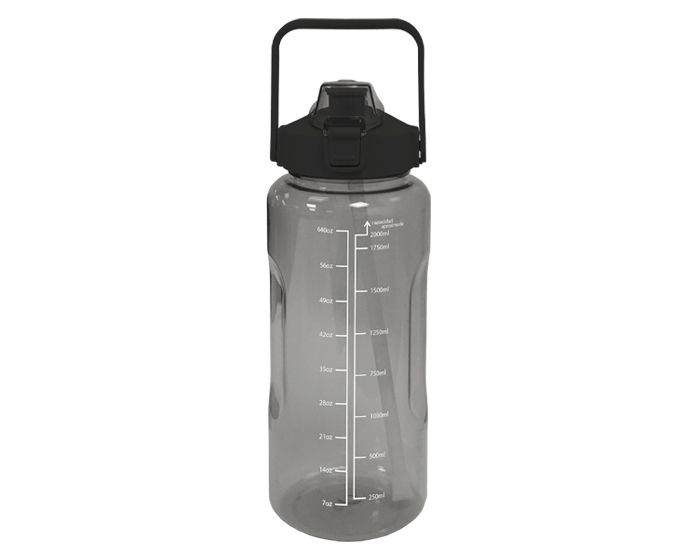 SULLEY - Cilindro de plástico en colores traslúcidos, con escala impresa en el cuerpo de la botella y resaques laterales para facilitar el agarre. Cuenta con tapa de rosca con asa, en color sólido y popote transparente, boquilla con sobre tapa con seguro en color traslúcido. CAP. 2 Lts.
