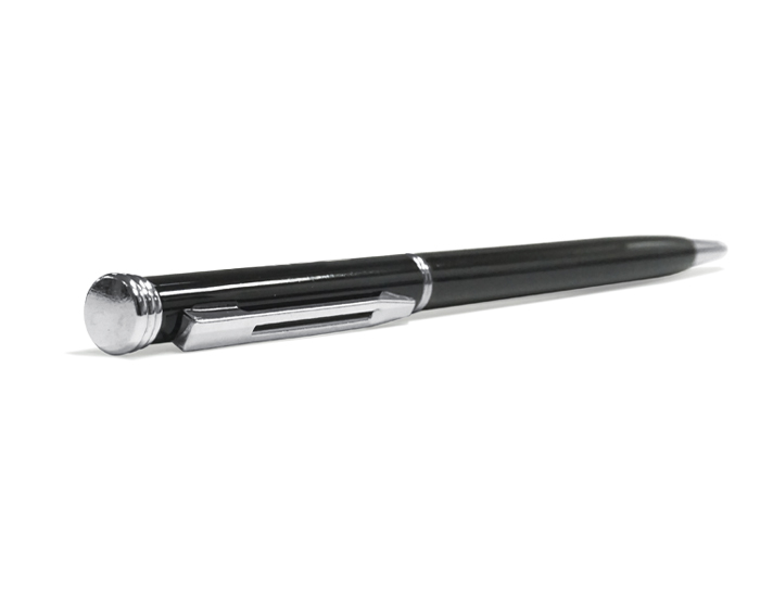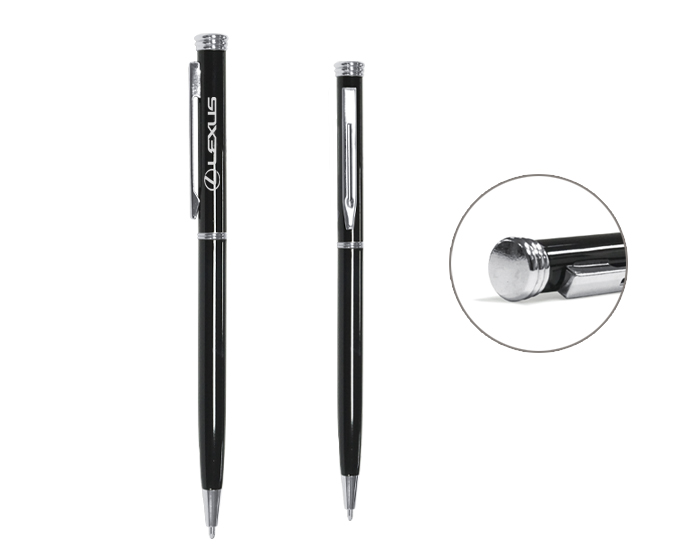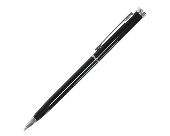 VIVALDI - Bolígrafo metálico de suave escritura y cuerpo delgado en color negro satinado, cuenta con clip, punta, anillos centrales y detalle superior cromados. Mecanismo retráctil.